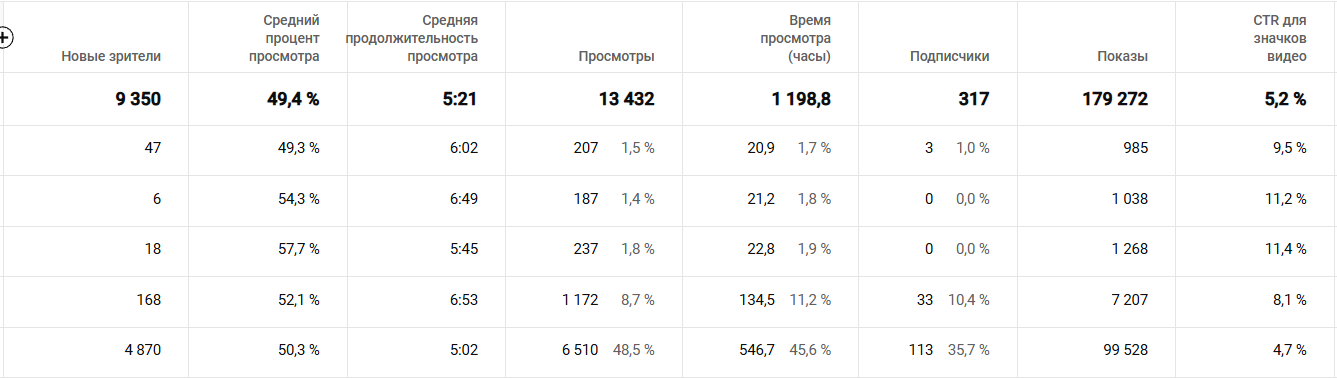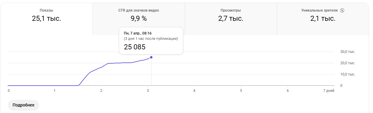 Первые 2 ролика на канале ютуб активно рекомендовал и они за неделю набрали по 6к просмотров и принесли 300 подписчиков. Третий ролик набрал 1к - большинство переходов от первых 2х Следующие 3 не набрали и двухсот Ютуб сейчас показывает мои ролики только моей подписоте (95% просмотров с подписки)