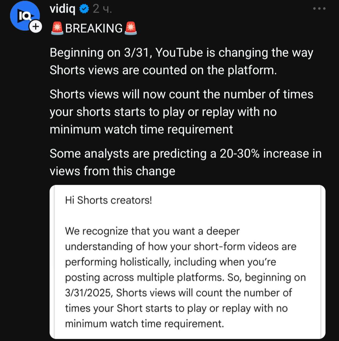 Начиная с 31 марта YouTube меняет способ подсчета просмотров Shorts на платформе. Просмотры Shorts теперь будут учитывать количество раз, когда ваш Shorts начинает воспроизводиться или воспроизводится повторно, без минимального времени просмотра Некоторые аналитики прогнозируют рост просмотров на 20–30 % в результате этого изменения