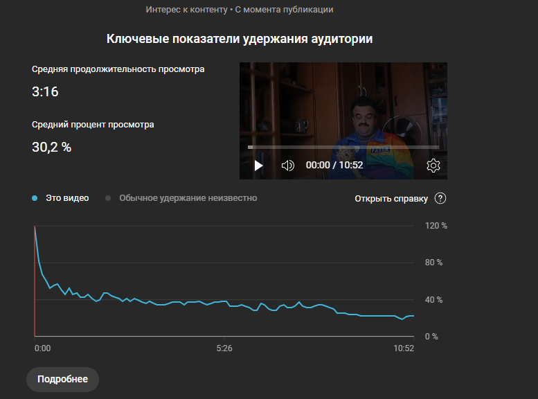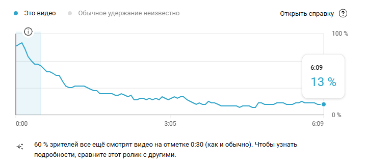 >>2348421 >это нормальная стата? Очень низкое удержание. Судя по графику, 50% отсеивается на первых секундах. Обычно у всех в самом начале просадка, но не такая высокая. Может у тебя звук всратый или какую-то хуйню добавил по типу интро. Либо отпугиваешь своим голосом/душным началом. >Влияет ли на продвижение, рекомендации? Да, напрямую. Чем выше процент, тем лучше. Хотя в последние годы ютуб походу больше смотрит на время удержание в минутах. Из-за этого новой метой стало клепать часовые ролики. >просматривать свой же видик десятками, а то и сотнями раз, до победного конца так сказать? Бравый ютаб сможет покарать негодяя? Да.
