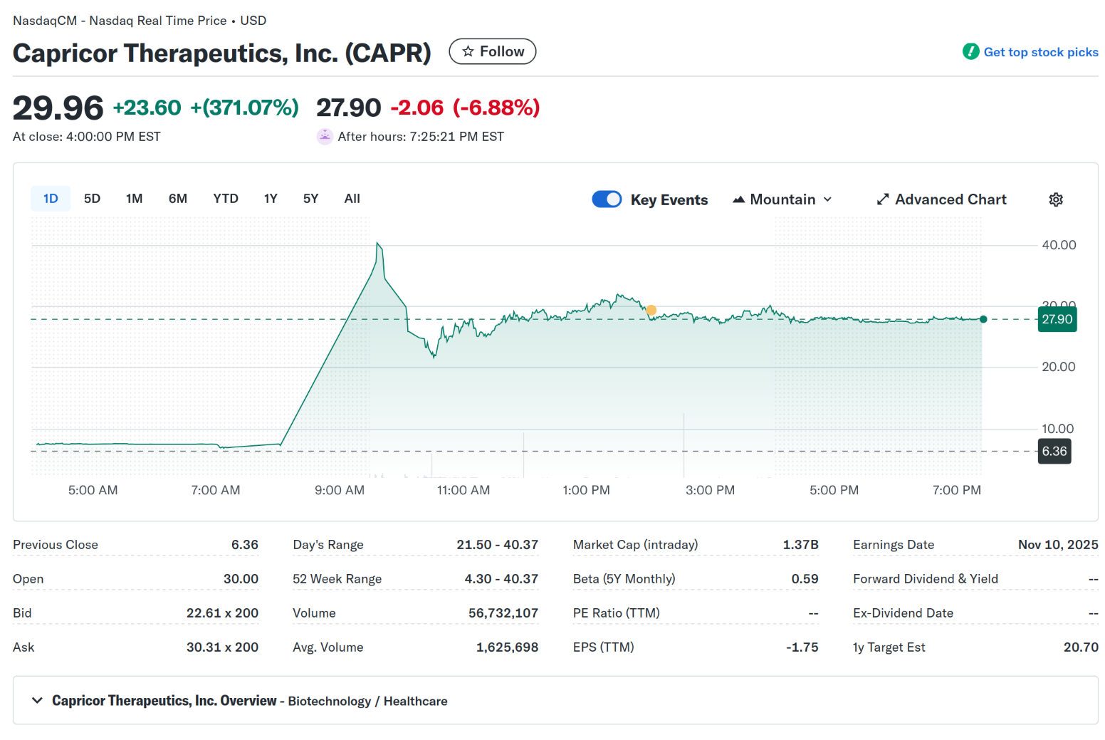 Привет всем. Купленный биотех CAPR стрельнул, третья фаза испытаний дерамиоцела была успешной. за день акции на 500-600% взлетели. В самом начале доходило до $40 акцию, сейчас держатся в районе $30. Изначально я вкладывал $1,200, потом продал 2 кола, купил на них ещё 30 акций. Месяц прошёл они истекли вне денег. Потом я снова продал 2 кола на месяц и купил ещё 37 акций. Итого рынок подарил 67 "бесплатных акций".