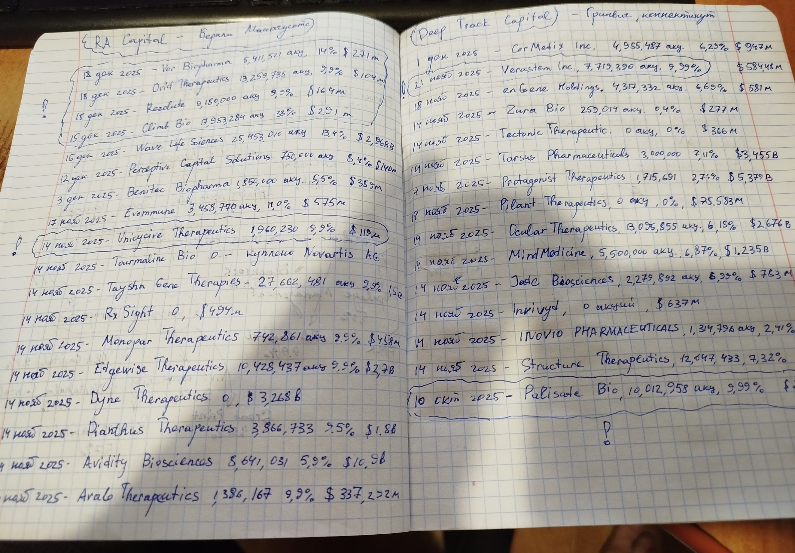 Накупил биотехов на 5 штук баксов: - UNCY (Unicycive Therapeutics) $2,5к баксов вложено. Лечат болезнь почек, когда почки не могут выводить фосфор. Текущее лечение: пациентов пичкают лошадиными дозами лекарств. Unicycive сделали "нанотаблеточку" и нужно одну дозу принимать вместо трёх. - VSTM (Verastem Oncology) $1к баксов вложено. Лечат редкий, но очень агрессивный серозный рак яичников низкой степени злокачественности. Это когда женщины с ним долго живут, но мучаются. Ставка на одобрение RAMP 201. - VOR (Vor Biopharma) $700 баксов вложено. Глубокая наука, концепция "защищенных трансплантантов". Если удастся, то это считай нобелевка (образно говоря) - PALI (Palisade Bio) $770 баксов вложено. Лечат язвенный колит. От текущего лечения у пациентов возникает тошнота и диарея. Palisade выпустили таблеточку, которая активируется только в толстой кишке и не вызывает тошноту. Потенциальный рынок колита - $20+ млрд