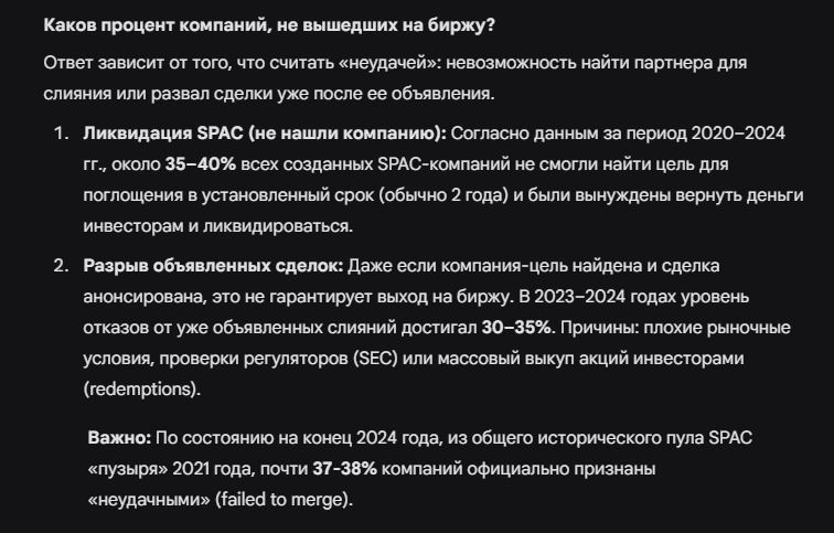 >>2277236 Естественно. Иначе зачем бы я рисковал деньгами? Смысл есть всегда, без разницы какой год - 24й или 28й или 30й. Сейчас стало даже лучше по сравнению с 2021м-22м. Посуди сам - тогда я еле наскребал чтобы купить жалкие пару тысяч варрантов. Сейчас у меня их 360 тысяч в портфеле. Меньше стало народу, нет такой конкуренции за таргеты. В 22м спаков было штук 400 и многие не находили таргеты и ликвидировались. Сейчас же не ликвидируется почти никто. Во первых спаков стало меньше, а во вторых, они уходят с биржи но не ликвидируются. Ищут на отс рынке, потом возвращают ся на наждак. Так что всё норм.