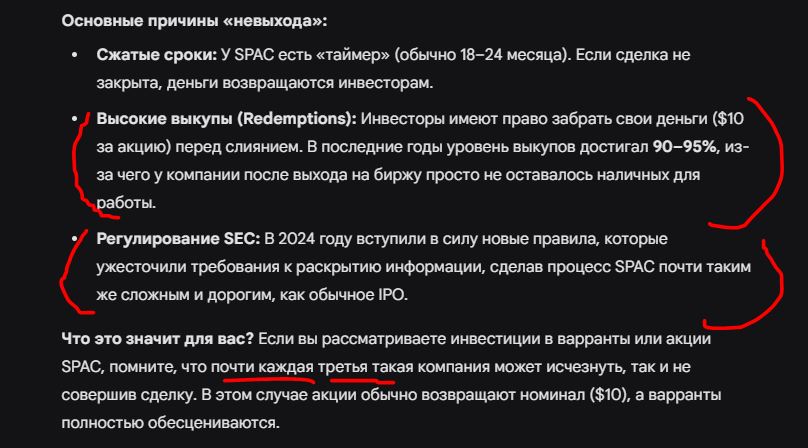 >может быть что он так и останется пустым весь срок варранта или конвертируется в какой-нибудь кал А я весь срок не жду. Я же приблизительно знаю что будет. Например если это oil & gas, ну и так ясно что это либо компания которая поставляет оборудование, либо которая сама добывает. А значит это профитный бизнес (инфа 99%) и акции до $1 не упадут. Мне достаточно дождаться самого объявления таргета, наварить на этом 300-400%, допустим я вложил $2,500 а продал за $11,000. Мне этого вполне достаточно. То есть в теории, можно ждать слияния и когда цена поднимется ещё выше (до $5-10 за варрант), но мне это зачем? То есть как это работает (на пальцах). У тебя есть рубль. Ты вкладываешь этот рубль и рискуешь своим рублём, чтобы сделать 5 рублей. Ты выигрываешь. Тебе говорят, если продолжишь играть то можешь заработать 15, а можешь потерять 5 рублей. Но ты выходишь из игры с 5 рублями в кармане. Я просто смотрю документы, если в последних отчётах увеличились траты на юристов, значит скоро будет объявление о сделке. Если же вестей долго нет, а срок подходит, я просто протухший спак сливаю с небольшим профитом/убытком и покупаю новый. Дождаться слияния - действительно зачастую бессмысленно (чаще всего они и правда падают). Но есть редкие исключения по типу EVAC-WT, их я планирую держать через слияние (думаю, акции на изи могут до $20/30 дойти)