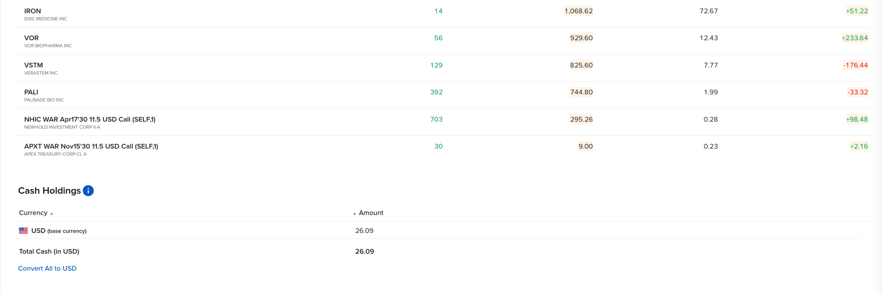 Я продал половину IPOD варрантов по $0.2999 (закрепил две с чем-то штуки профита). Накупил FTW варрантов на $1700 (слияние с нефтедобывающей компанией Presidio Petroleum). Накупил пять разных биотехов: Janux Therapeutics (JANX) - Препарат против рака простаты, данные лучше чем у конкурентов (Pluvicto, Amgen). Вложено $1,321 (профит $174). Disc Medicine (IRON) - Препарат от порфирии + 3 других препарата. Вложено $1,017 (профит $51.22) Century Therapeutics (IPSC) - Лечат аутоиммунные болезни (диабет 1 типа, волчанка). Разработали технологию iPSC (индуцированные стволовые клетки). Вложено $1,206 (профит $234). Rezolute (RZLT) - Лечат редкие болезни (а-ля гиперинсулинизм). Вложено $868.5 (профит $202.5). Werewolf Therapeutics (HOWL) - Лечат рак цитокинами, разработали технологию "умных цитокинов". Молекула в организме плавает неактивной, как только попадает в опухоль, местные ферменты (протеазы) "срезают намордник" и цитокин начинает убивать рак. Вложено $1,793 (профит $252.65).