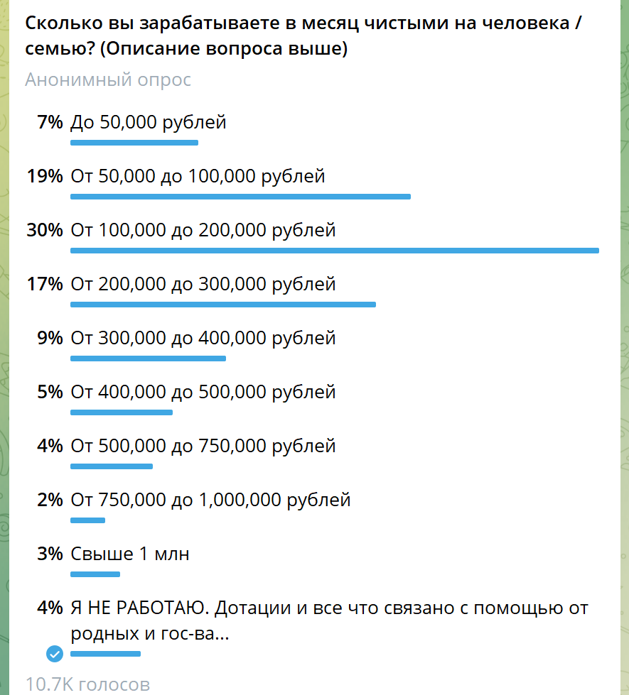 >>2359209 Чо тебе страшно, чел? Я открыл его же опрос в телеге по зарплатам. Вот что народ пишет. Ща меньше 200к уже даже в провинции не платят, ну мб санитаркам каким-нибудь.