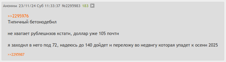 >>2369805 >Я вижу как уходят Ты блядь в ЕГРН это наблюдаешь или по уходу объявления с циан, где у оверпрайснутого лоха кончились шекели на продвижение или жене отчитались "ну зин щас нет смысла продавать за такие копейки, давай съебём с рынка до лучших вермён"? Даже если с низом рынка действительно что-то не так, это отличный повод торгануть оборзевших соседей вниз и взять у них. Но нет же, мы будем вести себя на ебанутом рынке недвижки как в ёбанной пятёрочке и ныть как всё недоступно.