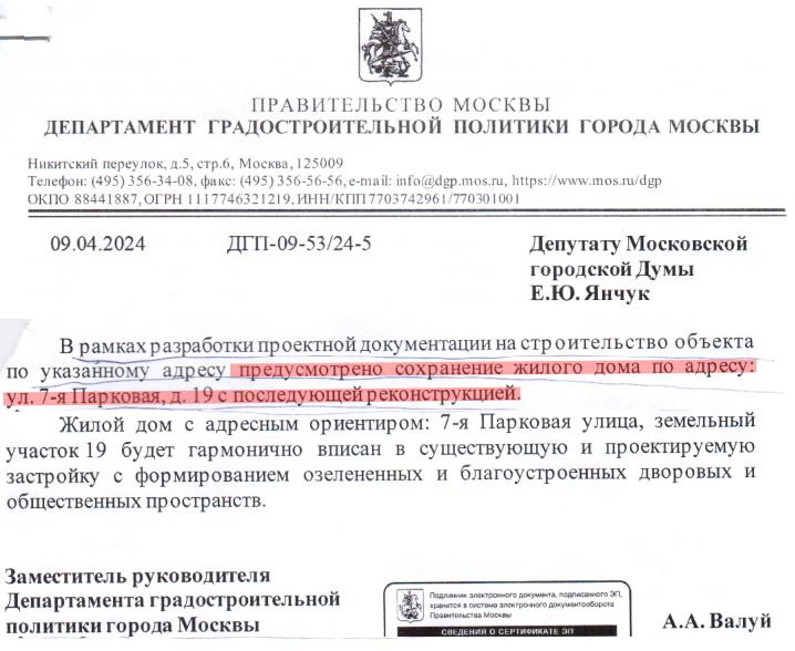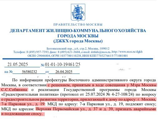 >Недавно из правительства Москвы пришёл ответ: >В соответствии с решением принятым в ходе совещания у мэра Москвы Собянина С.С. ... МКД по адресам: >7-ая Парковая д.19 подлежит сносу; >Верхняя Первомайская д.39 и д.37 признать аварийными и подлежащими сносу.