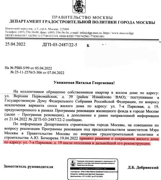 >С 2022 года по 2024 год власти Москвы официально уверяли собственников д.39 по В.Первомайской, что принято решение д.19, смежный с д.39, не сносить, дабы не разрушать д.39, в котором все 100% квартир находится в частной собственности граждан РФ.