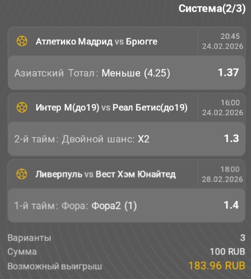 ало животные, нашел две ставки по 1.3 железобетонные просто хоть квартиру ставь. и это не про забил не забил победил не победил, рандом этот. тут чисто математика, которая ебёт. и если собрать экспресс из этих двух событий то будет 1.8. Халявных денег не бывает лол) блядь бывает)