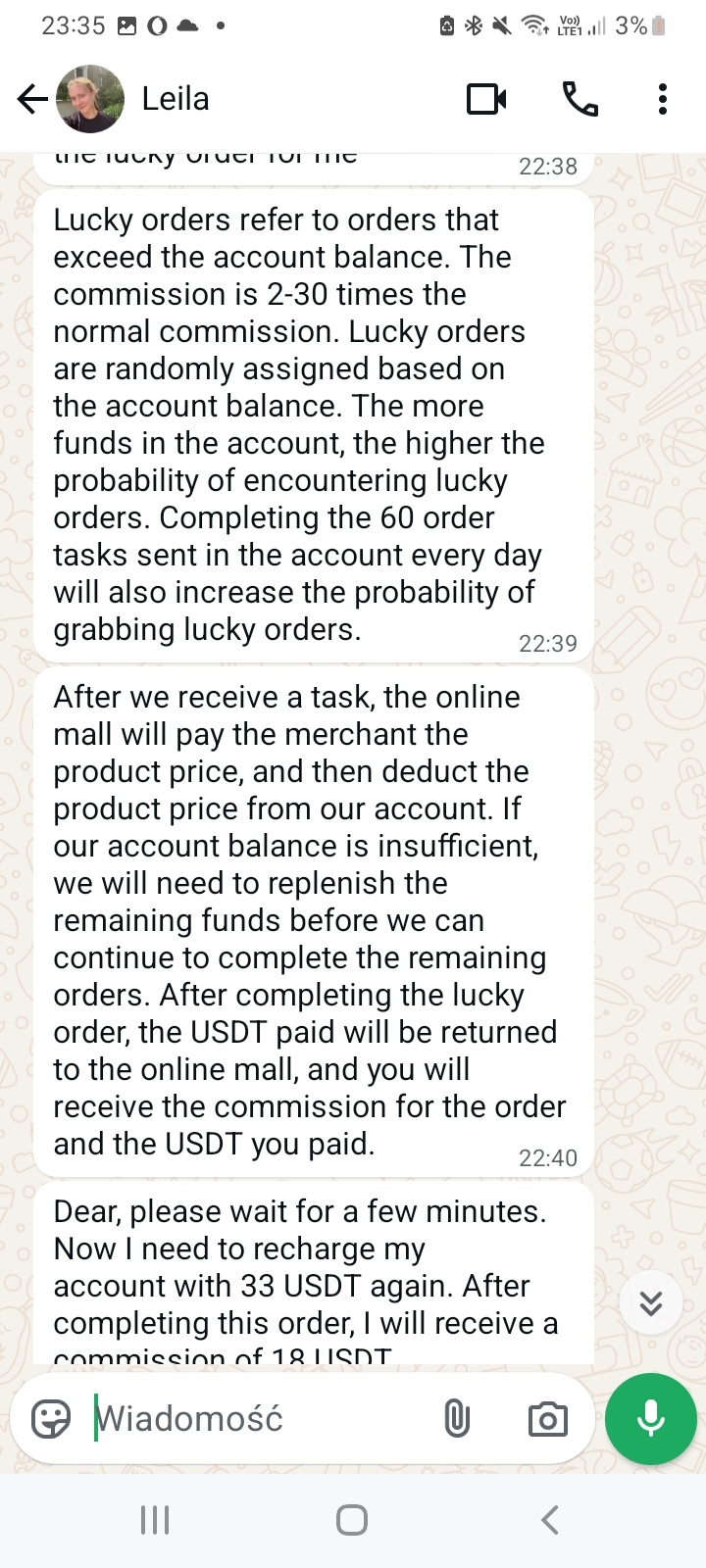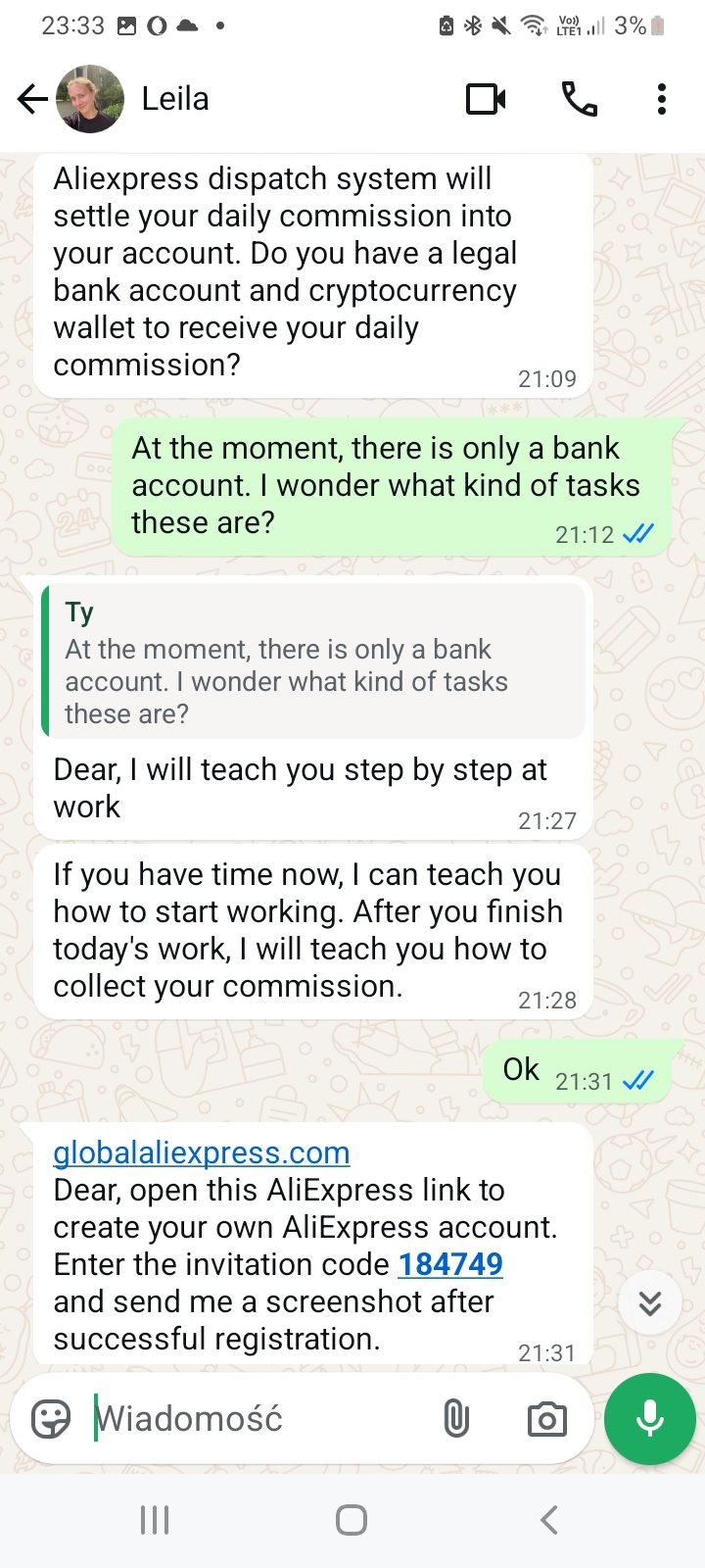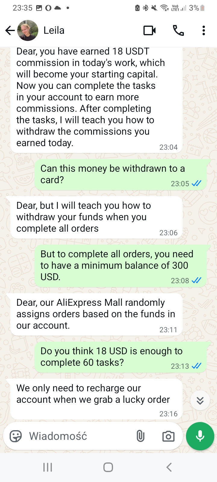 Всем Анонам привет, в общем хотел сначала написать это в разделе/B/ но подумал что это трэд больше про заработок поэтому решил здесь создать. В общем на прошлой неделе мне в телеге написала одна Тян она хотела забронировать отель но ошиблась номером, мы с ней разговорились и пошли в WhatsApp, общались на разные темы присылала свои фотки обычные и как она на лошаде катается, я их даже пытался по нугл фото и яндекс картинкам найти но ничего не нашёл, ибо порой мошенники бывает берут фото популярных тян из гугла и пишут От их имени. Общались неделю потом она мне сегодня написала что работает с сайтом Aliexpress и зарабатывает деньги за счёт комиссионных, и она мне показала как это делать, типо я по её ссылке создал аккаунт типо как реферат и буду получать по 15% от её выполненных заданий на Алике, потом она дала пароль от своего аккаунта я залогинился она пополнила счёт на 300 USDT и я стал выполнять задания с её аккаунта 60 штук. Я не супер хорошо знаю английский но как я понял что ты на Алиэкспресс покупаешь какой то товар что бы спрос поднять на него и тебе за это комиссия капает, а потом те деньги которые ты с баланса потратил на покупку тебе возвращается вместе с комиссией. Ну и с общем на её аккаунте я заработал 130 комиссионных перешёл на свой акк, и там у меня на счету появилось 18 USDT. Я спросил её мол как вывести эти 18 usdt на карту а она мне говорит мол пока рано выводить тв же мой ученик, эти 18 usdt тебе нужны будут для того что бы иы сам начал выполнять задания и получать комиссионные. Но там 60 заданий, мне кажется этих 18 USDT не хватит и мне в итоге самому придётся пополнить счёт. Это и есть разводняк аноны подскажи плиз. Кто то сталкивался с таким? На ALIEXPRESS за счёт комиссии реально заработать или это лохотрон? Тут я включил 4 скриншота переписки ещё 8 внизу в комментариях укажу.. что в целом думаете по этой ситуации Аноны?