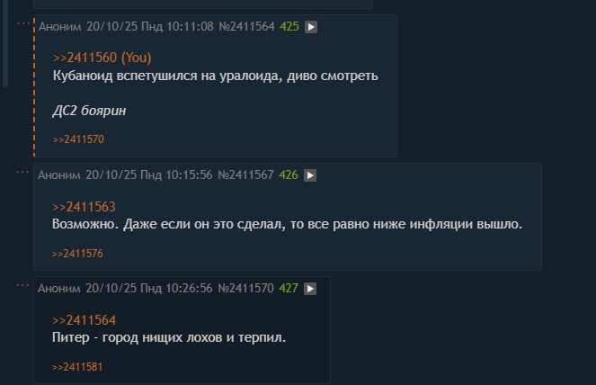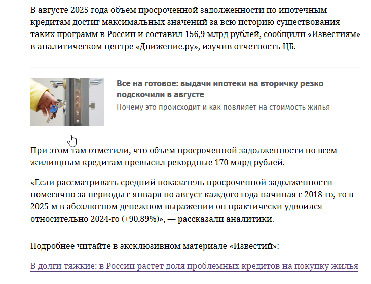 >>2411881 >Я такого не писал, ты же в курсе, что здесь разные люди находятся? Манера общения и маняврирования похожи, ок проебался. >Никто не отменял семейку, военную ипотеку, рассрочку и прочие схематозы от застроев. >Никто не отменял семейку, военную ипотеку, рассрочку и прочие схематозы от застроев. Семейка была заморожена в начале года, ну как заморожена, ее просто не выдавали. ИТ-ипоту покромсали и регионализировали. Везде лимиты порезали >Во-первых, никакого ограничения в новых объектах нет и быть не может, по той простой причине, что застройщик - это коммерческое предприятие, которое не может взять и перестать строить, ему нужно постоянно оборачивать капитал. Может, большое кол-во проектов сейчас заморожена. >Нет, не тянет Почему тогда вся недвижка выросла после ввода льготки? Сравни цены в 2020 и сейчас. Что так бустануло вторичку? Всем резко потребовался бабкин хрущ или дело в том, что первичка начала расти? >Ну это уже или откровенно жирный троллинг или просто голословное утверждение, которое не подтверждается никакими фактами. Первая же ссылка в поисковие, вот тебе графики 2022-2025. И смотри какая забавная корреляция, с декабря 2023 ставка ЦБ стала 16 и посмотри когда был пик роста ренты, ну и дальше понаблюдай корреляцию. >6 лет назад я снимал ровно такую же 40 метров евро 2 за 23,500 За твой Гавнас не поясню, но судя по тому что это за мкадом, то очевидно что деньги там и не нужны. За МКАДом зарплаты в несколько раз меньше, чем в ДС. Это правда. Но нужно учитывать, что у каждого жителя замкадья есть огород и приусадебное хозяйство. Жители замкадья питаются с огородов, выращивают птицу и скот. Поэтому деньги им нужны только на одежду и коммунальные платежи. А значит вполне справедливо было установить им меньшие зарплаты, чем в Столице, где приходится покупать в том числе и продукты питания. Кроме того, жителю Столицы нужно посещать культурные заведения и покупать машину. В то время как в маленьких уютных городках всё близко друг от друга. А еще за МКАДом много лесов. Можно поймать лисиц, сделать себе шубу. По сути, люди за МКАДом одеты в отличнейшие меха, которые в столице стоят очень дорого. Неудивительно, что у них зарплаты меньше. По сути, им деньги особо и не нужны.