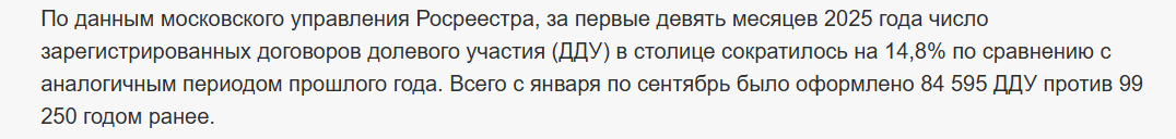 >85к сделок ДДУ за 9м 2025 при ебейшей ставке ЦБ и практической отмены льготной ипотеки. Никто не отменял семейку, военную ипотеку, рассрочку и прочие схематозы от застроев.