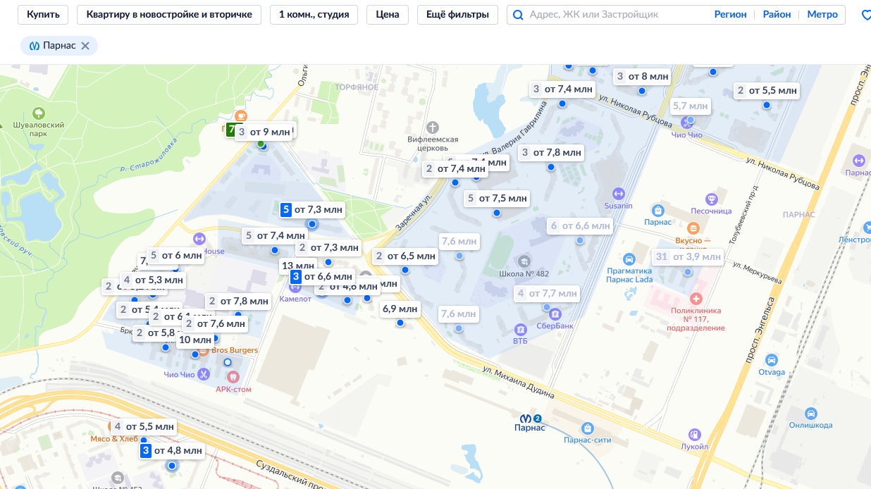 >Сравни цены в 2020 и сейчас. Что так бустануло вторичку? Давай сравним. Скринов у меня, естественно, не осталось, придется поверить на слово проверять самому, но в 2019 однушки на Парнасе стояли по 5.5-6.5кк. Вот тебе актуальные цены. Где ты этот буст видишь? Да, есть рост на 1-1,5кк, но ни о каких иксах речь даже близко не идет, даже до официальной инфляции не дотягивает.