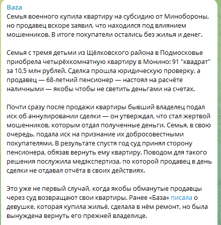 Журналисты подобрали отличный случай, где очередная мразь “потерпевшая” собрала комбо: а) на допрос под видео в банке в момент получения денег за квартиру клялась, что никакие мошенники ее не ведут; б) обещала на вырученные средства купить дом в Подмосковье, но, разумеется, ничего не купила; в) обратилась за возвратом жилья только спустя полтора года, когда покупатель сделал ремонт.