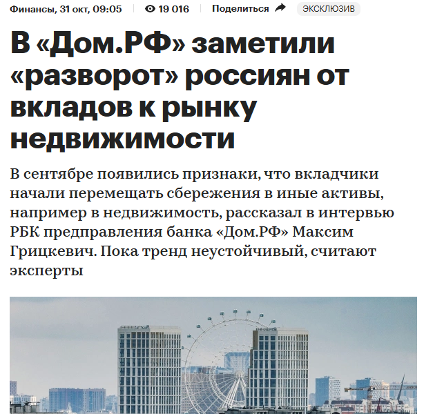 Продажи первички пошли вниз. Застройщики занесли куда надо, раскрутили историю с бабками, обрушив тем самым рынок вторички и вынуждая покупателя покупать первичку. Первичка валится, все знают что цены перегреты. Большая часть недвижки в России это не инвестиционный, а чисто потребительский актив, ты сильно переплачиваешь в момент покупки, да ещё и кредитные деньги привлекаешь. Мало того, что эту недвижку уже в момент покупки ты не продашь даже за -10% от её стоимости, так ещё и кредитные деньги сверху. То есть недвига, в подавляющем большинстве случаев это не инвестиции, а чистое потребление, за очень редкими исключениями, которые продаются "своим по связям" и простому покупателю не доступны.
