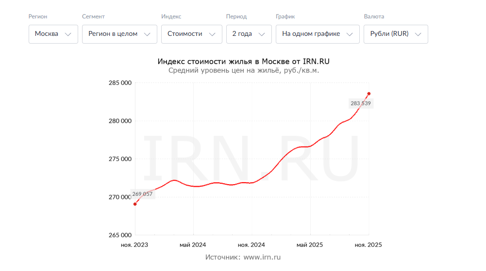 >Москва заняла первое место в рейтинге российских мегаполисов с наибольшим ростом стоимости квадратного метра на вторичном рынке. С начала года средняя цена «квадрата» в столице увеличилась на 24,5%, до ₽439,8 тысяч. Это в 3,5 раза больше официального уровня инфляции и где-то в 2,5 раза больше альтернативных расчетов.