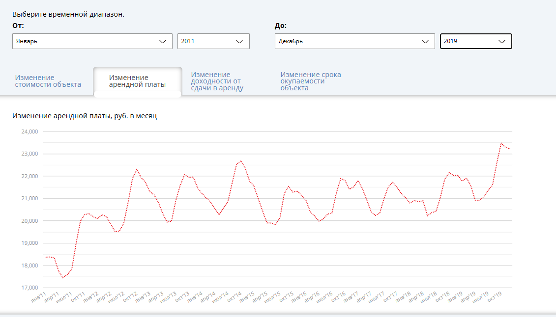>аналогично в той или иной степени (наверняка меньше инфляции, но уж точно не в разы) проиндексируется стоимость квартирки. Для совсем деревянных, вот график стоимости аренды с 2011 по 2019 год, за этот период цены на все выросил ровно в 2 раза. А депозиты (облиг у меня нет, ты обосрался с детектом) все это время генерировали доход и капитализировались сложным процентом.