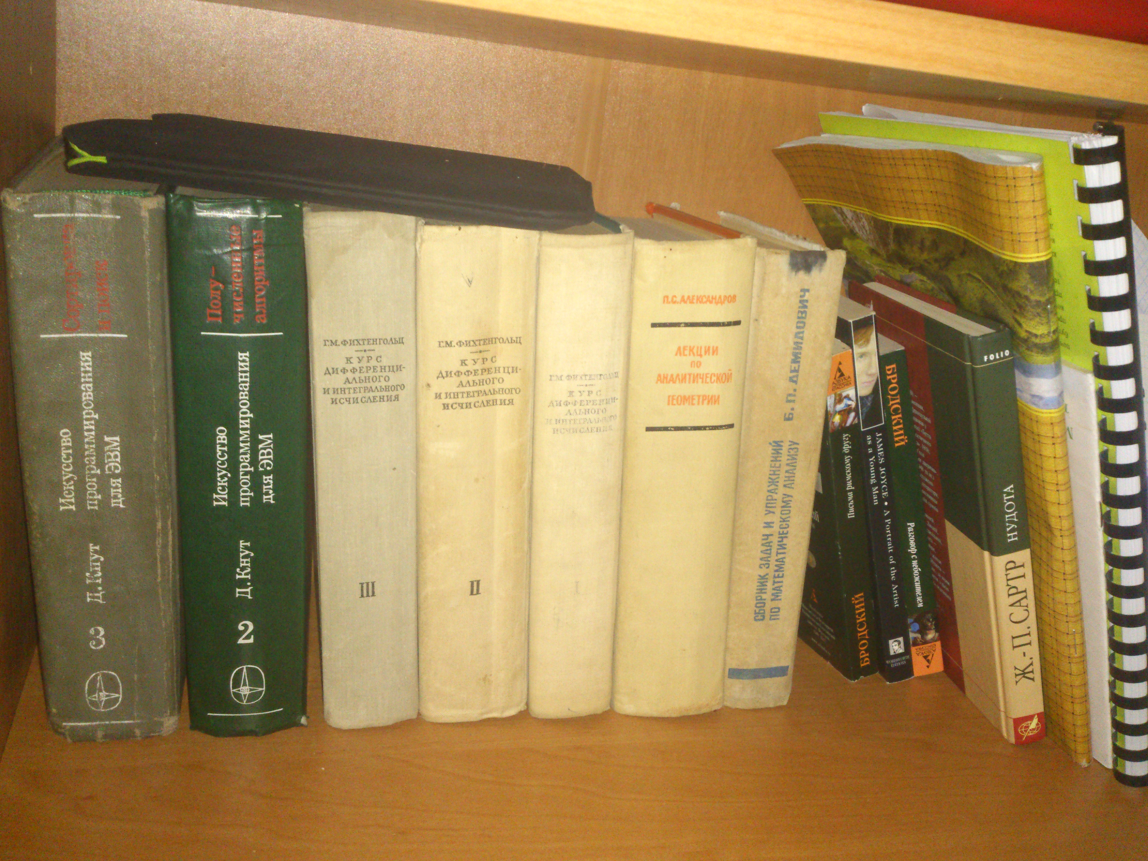 Зеленая книга - это математическая логика Мендельсона, белая и тоненька - Краткий курс математического анализа Натансона.