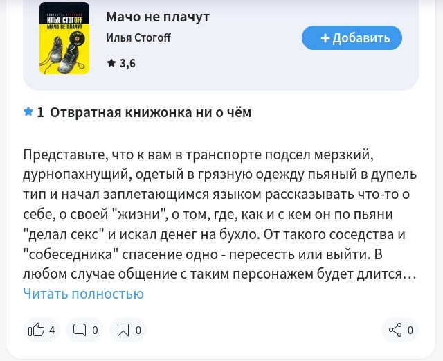 Ну и вот этот >>1010000 прав, тут в основном формат такой, что про любую книгу можно сказать "ну это набор слабо связанных историй из жизни [категориянейм]", и все что тебе надо решить - это хочешь ты больше читать про наркоманов, ролевиков или скупщиков краденого. Хотя конечно по стилю изложения иногда есть что сказать, может накатаю пост со своими впечатлениями попозже