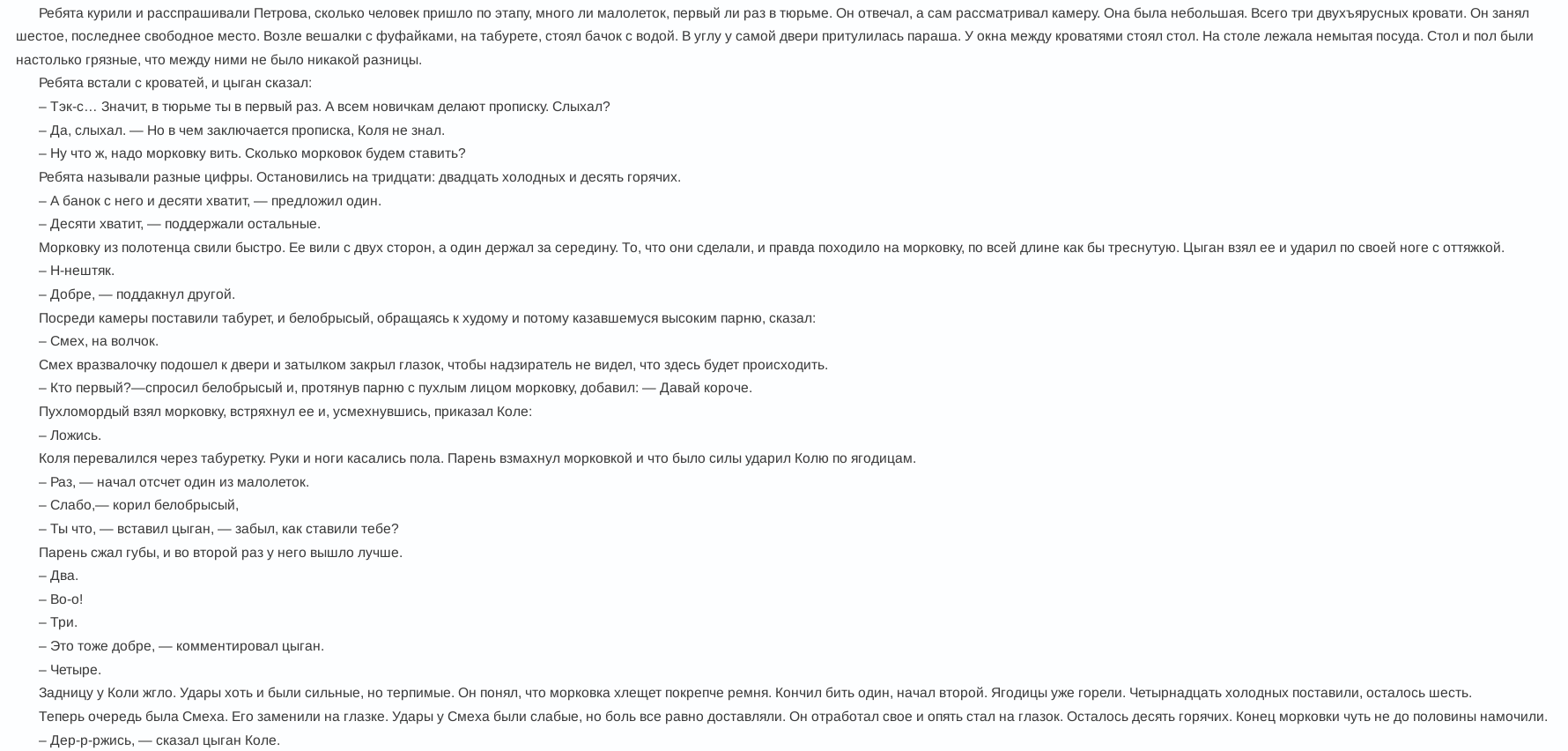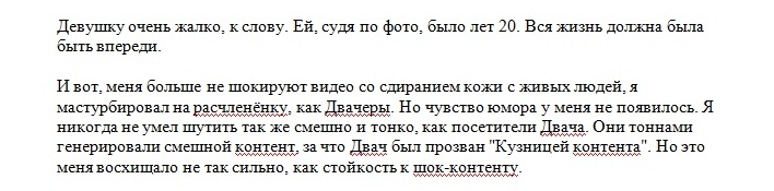 "Меня зовут Максим. На момент событий книги мне было 22 года. Моим воспитанием, с 14 лет, занимался интернет. Причём самая его глубинная часть. В 2006 году я попал на форум журнала об играх, оттуда на сайт для анонимного общения – Двач, где, благодаря анонимности, было большое разнообразие мнений, а так же запрещённый контент на любой вкус. От банального снаффа до детской порнографии. Сперва, увидев ролик, на котором чеченцы отрезают головы русским солдатам, мне стало не по себе. Но я видел, что у постояльцев Двача другая реакция, и встречаются комментарии вроде: "Подрочил". Диапазон реакций, на это видео, был от "всё равно" до "Так и надо ватникам!". Я не понимал, почему я не могу радоваться тому, чему радуются остальные? Почему я не могу мастурбировать на видео отрезания голов, как это делают посетители Двача? Что же со мной не так? И, чтобы добиться такой же устойчивости к шокирующему контенту, я начал смотреть видеозаписи с убийствами и пытками десятки раз, по кругу. Так выработалась толерантность к первому видео, начал я с отрезания голов российским солдатам, потом я смотрел на видео срезания кожи с живого человека, мексиканским наркокартелем. Мексиканцы, в детстве, меня поразили своей жестокостью. Но, при этом, у меня появлялись мыслишки, как можно было сделать ещё более жестоко. Например, они сжигают заживо своих провинившихся и конкурентов, но в средневековье к температуре был более тонкий подход: они помещали человека в воду, и постепенно её нагревали. Впрочем, задача мексиканцев не сделать как можно больнее, а напугать конкурентов, и это я понимал даже в 14 лет. Когда я выработал толерантность к шокирующему контенту, я вспомнил о том, как некоторые Двачеры мастурбировали на фотографию, где маленькая девочка разобрана по запчастям, и каждая её косточка аккуратно сложена, в порядке от маленьких к большим, и отдельно лежит голова. Это был очень непростой вызов, потому что ничего возбуждающего я в этой фотографии не видел. Но я хотел быть таким же, как Двачеры – мне нравилось их чувство юмора, умение зреть в корень, независимость их мнения от мнения окружающих. Эти их черты восхищали меня, и я хотел быть на них похожим. Поэтому было решено – надо мастурбировать на расчленённую девочку. Но у меня даже не вставал на неё... Чтобы это преодолеть, я посмотрел, немного, классическую BDSM-лесбо-порнуху, и, когда член встал, я сделал дело, глядя на окровавленные кости и отрезанную голову девочки. Девочку очень жалко, к слову. Ей, судя по фото, было лет 10. Мексиканцы не жалеют даже детей – сволочи. И вот, меня больше не шокируют видео со сдиранием кожи с живых людей, я мастурбировал на расчленёнку, как Двачеры. Но чувство юмора у меня не появилось. Я никогда не умел шутить так же смешно и тонко, как посетители Двача. Они тоннами генерировали смешной контент, за что Двач был прозван "Кузницей контента". Но это меня восхищало не так сильно, как стойкость к шок-контенту."