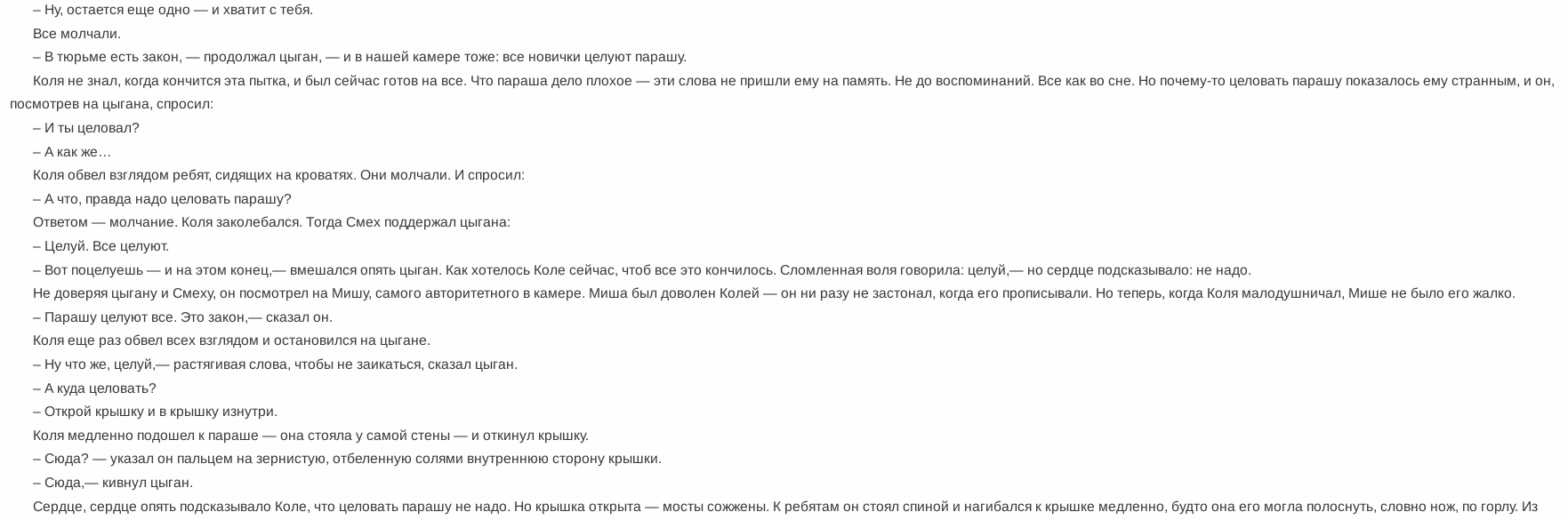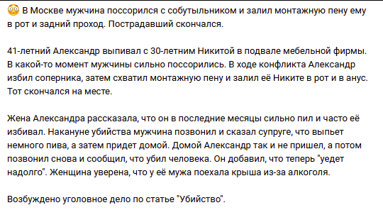 >>1031379 "Она паску ела… Я ее раком поставил на диване… Ну так… вдоль…— Ням-ням махнул рукой и показал, как именно.— Ебу ее, она там че-то стонет, а потом замолчала… А тогда Пасха как раз была… Ну на столике, возле дивана, паска на тарелочке стояла, освященная… Смотрю, а она паску рукой отламывает и ест… Ах ты ж скотина! Ну я ей по печени разок засадил! Ну так, не сильно, чтоб не обосралась, а то у меня раз был такой случай…"