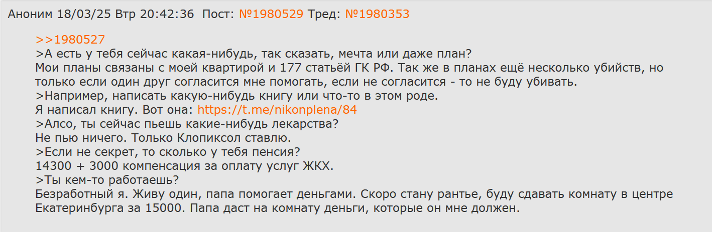 Кста, есть еще один чел из музача, более близкий к тематике /бо/. Иван Жданов, он же Самех (хотя, по мне, изначально этой кличкой пользовался другой анон чисто по рофлу). Тоже болен шизой в тяжелой версии. Публикует тексты, в которых миксует поп-культуру с мешаниной из философских трактатов в стиле: "в народе колхозник, в магазине продавец". Фактически, человек-нейросеть. При поверхностном прочтении, кажется, будто написано что-то очень сложное и умное, при вдумчивом - сразу понятно, что графоманская каша из невпопад употребляемых терминов и неймдроппинга.