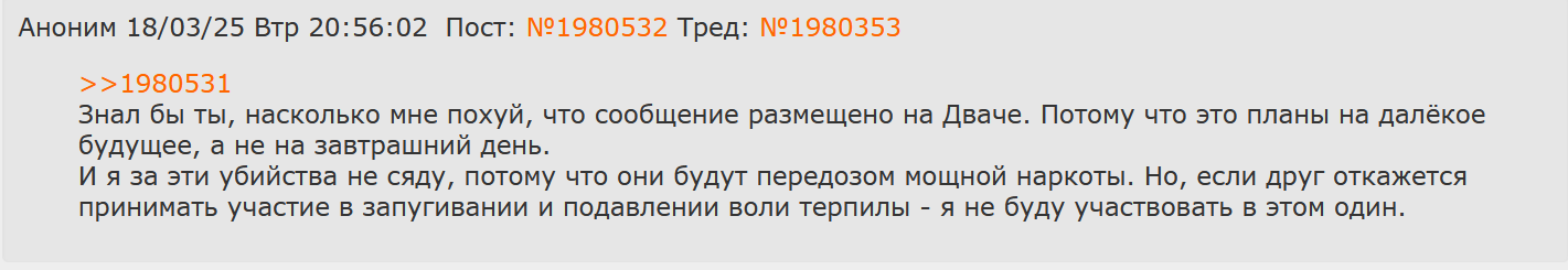 Пущай я тоже побуду сегодня немного шизом, коим я и являюсь в конечном итоге, но я, по крайней мере, никого еще не убил.