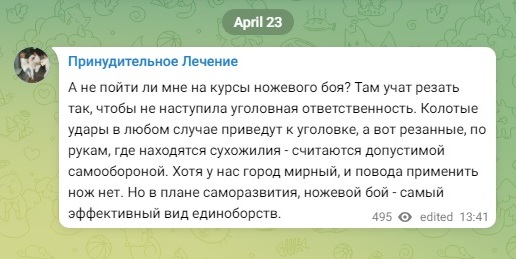 >>1012520 >: он ВМЕНЯЕМ Скорее всего сложилось такое впечатление вследствие сухого письменного изложения событий непрофессиональным писателем, ирл он прошел несколько линий обороны врачей которые на раз-два футболят мастермайндов-симулянтов, всех впечатлял своей ебанцой и пустыми глазами всё в таком духе. Я зайду с другого бока, успокою тебя (или расстрою). >сидеть на киче общим порядком Допустим, даже если пошел, то как первоход отправился бы не на особый (анально затянутые до абсурда гайки, побои и камерная система), и не на общий ("большая малолетка", балаган по понятиям), а 100% на строгач, по сути своей рабочий поселок. Сидеть долго, контингент спокойный, все подчинено работе, из-за нее время летит незаметно. Мужики ходят на швейку 2/2, для нашего пассажира идеальный варик надеть рога, пойти в красные и стать дневальным (или завхозом), подметать барак три раза в день пока остальные стоят на плацу ждут пересчета, в остальное время ебать вола лежать на шконаре и читать книжки с библиотеки, в каждом бараке есть оборудованный мини-кинотеатр с мегаплазмой. Учитывая типаж и наклонности Ниши тот пошел бы дальше, в какие-нибудь дневальные штаба, таскать чай операм и жить в комфортабельном бараке для приближенных на всех привилегиях. В общем все совсем не как в роликах Десантник заходит в хату к блатным, горя он там бы не хапнул и не пропал, все условия для жизни есть. Да и нигде не пропал, если он действительно такой языкастый коммуникабельный черт каким себя изображает.