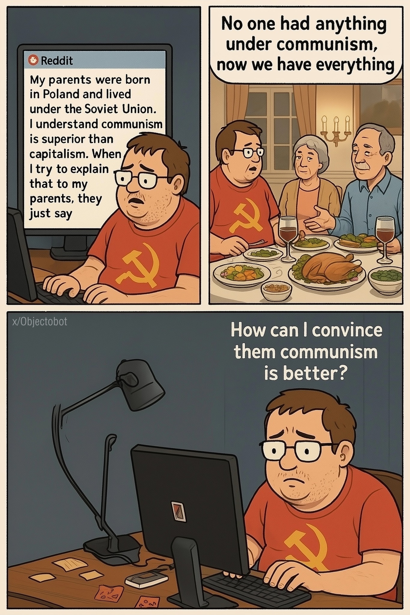 >>1016403 И прислал тупой мем, смысл которого от меня ускользает. Я не принадлежу к твоей религии, я не понимаю в чем прикол этой картинки. Какой-то намёк на то, что родители этого чувка жили при коммунизме? Почему под коммунизмом они жили? Коммунизм сущетвует как государство? И оно сменилось на капитализм? Абсолютная безграмотность, в первые две недели хождения в кружок даются определения коммунизма и определения государства, это база детсадовского уровня просто, но автор мемна слишком туп чтоб вникать в какую-то там философию и экономику.