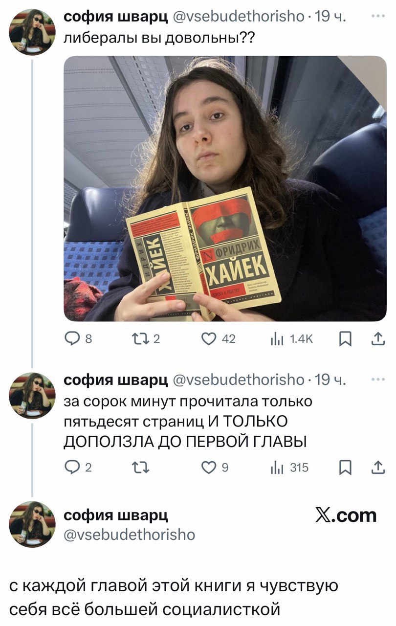 Ничего они в массе своей не читают, максимум Пал Коляя или что-то подобное из инфоциган осилят. Неважно даже что, главное чтобы было на слуху, типа стильно модно молодежно. Остальное для них просто часть образа нитакойкаквсе в соцсетях, как например >>1015050 Исключения типа Полины Парс только подтверждают правило. В чём я не прав?