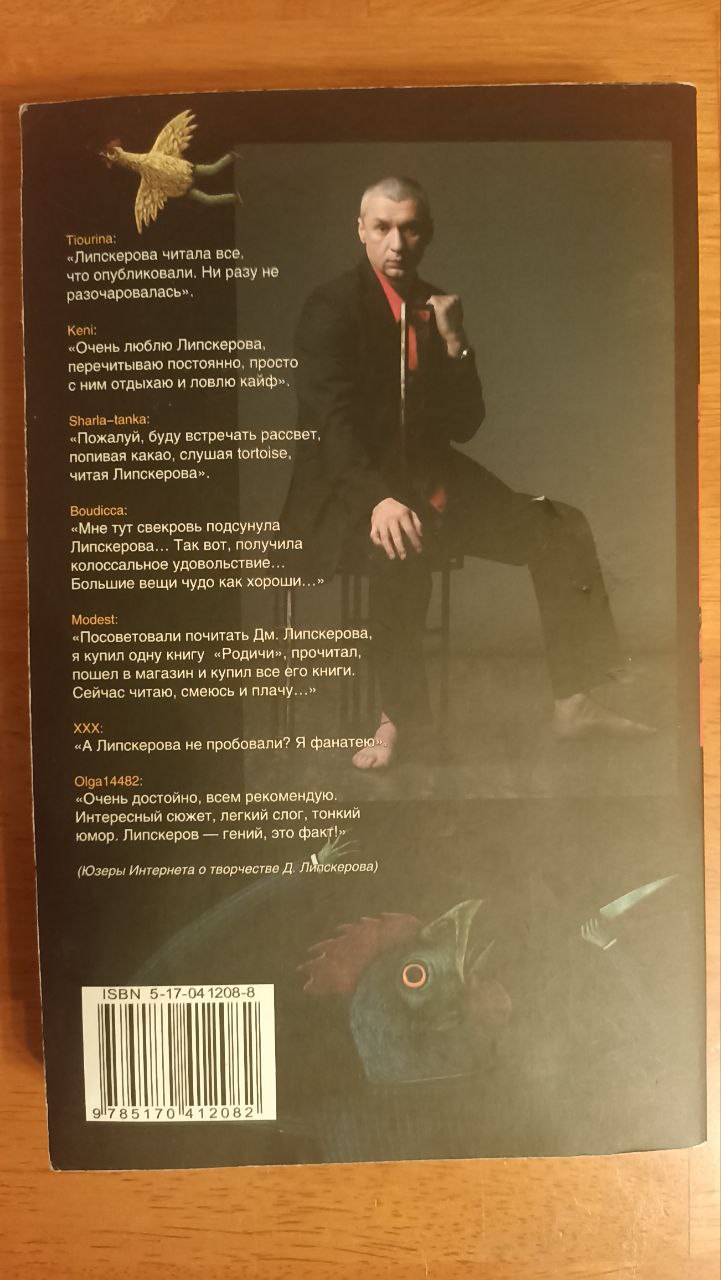 Дмитрий Липскеров - Сорок лет Чанчжоэ Это я пару месяцев назад устроился на работу. Есть свои преимущества, на жратве не надо экономить, какая-никакая а всё же социализация, с людьми общаешься. И вот дали книгу почитать, её страшно сказать сильно котирует кто-то там из руководства компании. Я ничего не читал до этого у Липскерова и… это очень плохо. Скучная, плоская, небрежно написанная и совершенно неинтересная вещь про какое-то нашествие куриц в городе российском городе Чанчжоэ, пригоршня мистики, немного детектива и отсутствие любой интриги. Я так и не смог атрибутировать в какое вообще время идет действие, книга 1997-го года, но действие идёт в России до революции? Полиция, расстояние измеряется в футах, в то же время много машин и фривольные сексуальные нравы… В общем к бесу, это просто плохая проза. Что, наверное, следовало понять по обратной стороне обложки, просто посмотрите. Фото писателя без обуви и отзывы каких-то ников… Издание 2007-года, да уж, смотреть больно. Теперь даже думается, в какую же компанию я устроился, что люди такие книги восхваляют?