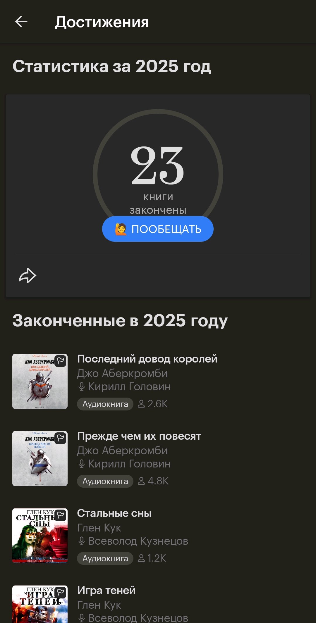 Веду лайвлиб, однажды из-за подобных тредов стало интересно а сколько вообще за жизнь прочитал и завёл. Суммарно под 700 книг вышло за 35 лет. Не вспомнил всякие однообразные пьесы со школы и ерунду разную, некоторые забыл или вообще не помню содержания. Каждый год в вызове на год ставлю себе попытку под 100 книг сделать, но иногда пропадает интерес, особенно летом, иногда просто не хочется, иногда вообще год с 3 книгами за год заканчивал. Один раз только дошел до финиша. Читаю только с телефона, стараюсь по 200 страниц в день делать (хз сколько это реальных страниц в книге), это на три-четыре часа где-то. Иногда не идёт - оставляю по 100, 150 страниц. Иногда по 300 получается, когда особенно интересно. Личный рекорд -700 страниц был, "Обитель" Прилепина, ебать охуенчик.
