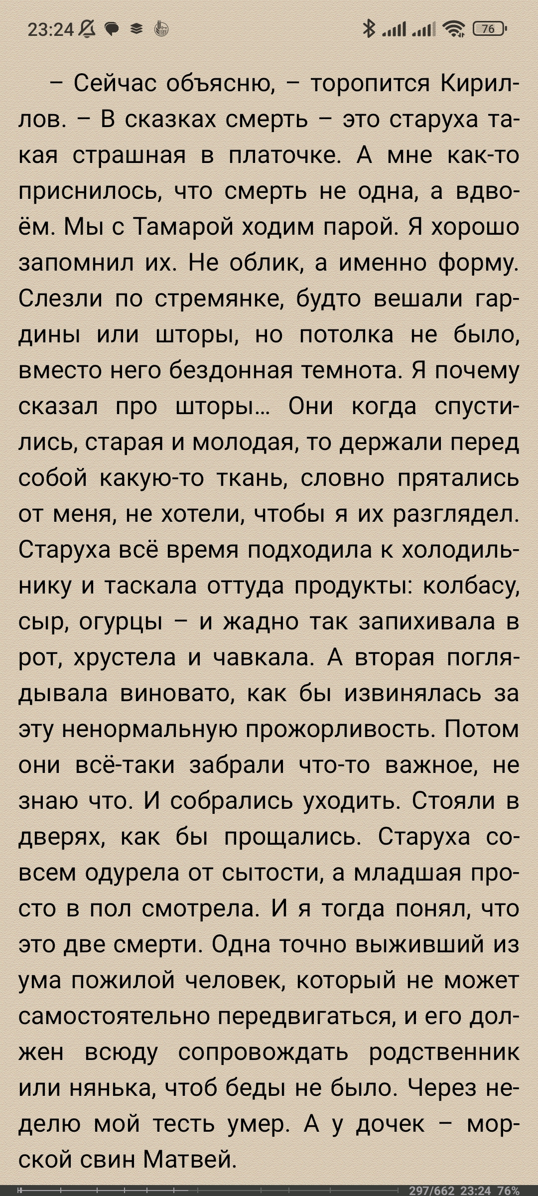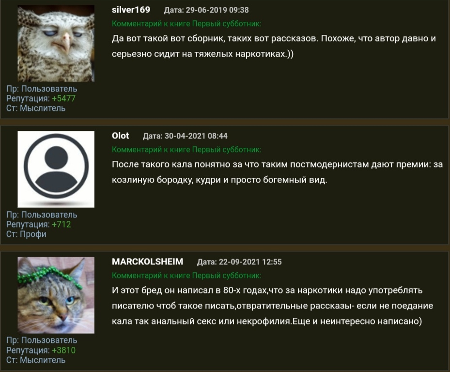 А у Сорокина понравились только Норма и Очередь, думаю 30 любовь Марины прочесть как-нибудь, но после первой страницы, где описывалось то как посрал её ебырь, как-то не хочется читать, учитывая что после Марины он написал Роман (не читал) и Сердца 4-х (которые не понравились совсем, просто набор гуру, как подметил выше приключенческий роман с элементами боевика, но стоит добавить что еще и без сюжета толком), думаю с Марины он и начнёт свою "шокирующую деятельность", как в Первом субботнике. Вообще, Сорокин как автор не понравился в принципе, слабый писатель на самом деле, хоть местами прикольный, да и родной будто уже, может в будущем Голубое сало как раз прочту ещё, но не скоро наверное. Хотя "Настя" отличный рассказ как раз того периода переосмысления творчества, после Сердец.