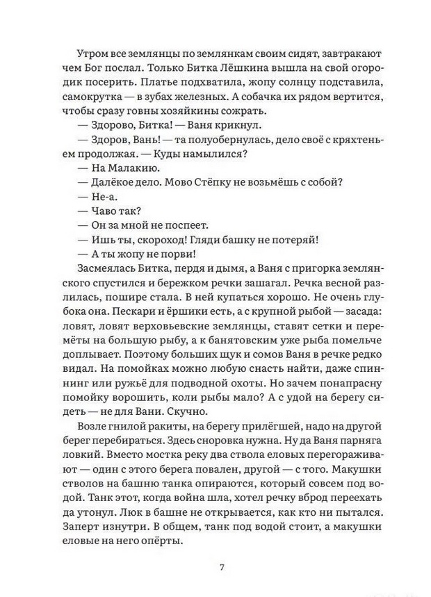 >>1027440 Узнается моментально: «В середине: “За Русский мир на смертный бой летит стальная эска-а-дрилья!!” – со всей мочи пропел бухой Устин и вдруг всхлипнул так, что все пацаны смертельно затосковали, словно оказались на похоронах старого школьного друга. В конце: Толян брел наугад по осеннему лесу. Обсосанные хмарью деревья толпились, словно скелеты великанов. Небо набухало. Вдруг нога подфутболила что-то живое в пожухлой траве: еж! Толян присел на корточки, взял в руки колючий клубок. И сразу печаль упала на него с серого неба. “Я тоже еж, – подумал он. – Только иглы свои порастерял. А новые ни хера не отрастают”. Он бережно опустил ежа в траву, встал. И вдруг как-то сразу, обвалисто и внезапно, ему захотелось до боли, до изжоги, до стона нутряного и до слез просраться в этом лесу и подтереться опавшими листьями. – Как во сне, бля… – прошептал он и рывком расстегнул свой старый дембельский ремень».