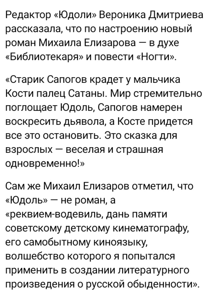 >>1021845 А мне понравилась елизаровская "Земля". Это такой затягивающий, вязкий текст - проваливаешься в него как в трясину и хорошо там, уютно. И "Юдоль" жду. Забавно, кстати, что и Елизаров, и Сорокин выпускают новинки в один год.