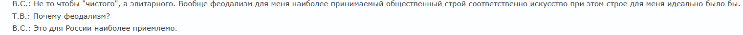 Вот, кстати, выше писал уже про его интервью: "Интервью Татьяны Восковской с В.Г.С. ". Там где он про свою меркантильность. Это раз. А "два" прикрепляю к этому сообщению - ознакомьтесь со словами кумира. Он просто хочет "ту Россию которую мы (они) потеряли". И конечно же барчонком там быть. Ну, так все хотят... наверное. Но не крепостным ни разу. А ещё он сильно Берлин и гермаху зассаную нахваливал, аж до скрежета зубовного и соплей на усах. Наверное, всё таки, всё хорошее он через свою призму поносную пропускает. Ведь советская власть его ГОНБИЛА! Больше чем Маяковский. И вообще все поэты алкаши, а он культурно водочку пробирует, от случая к случаю. Понимать надо - это другое.