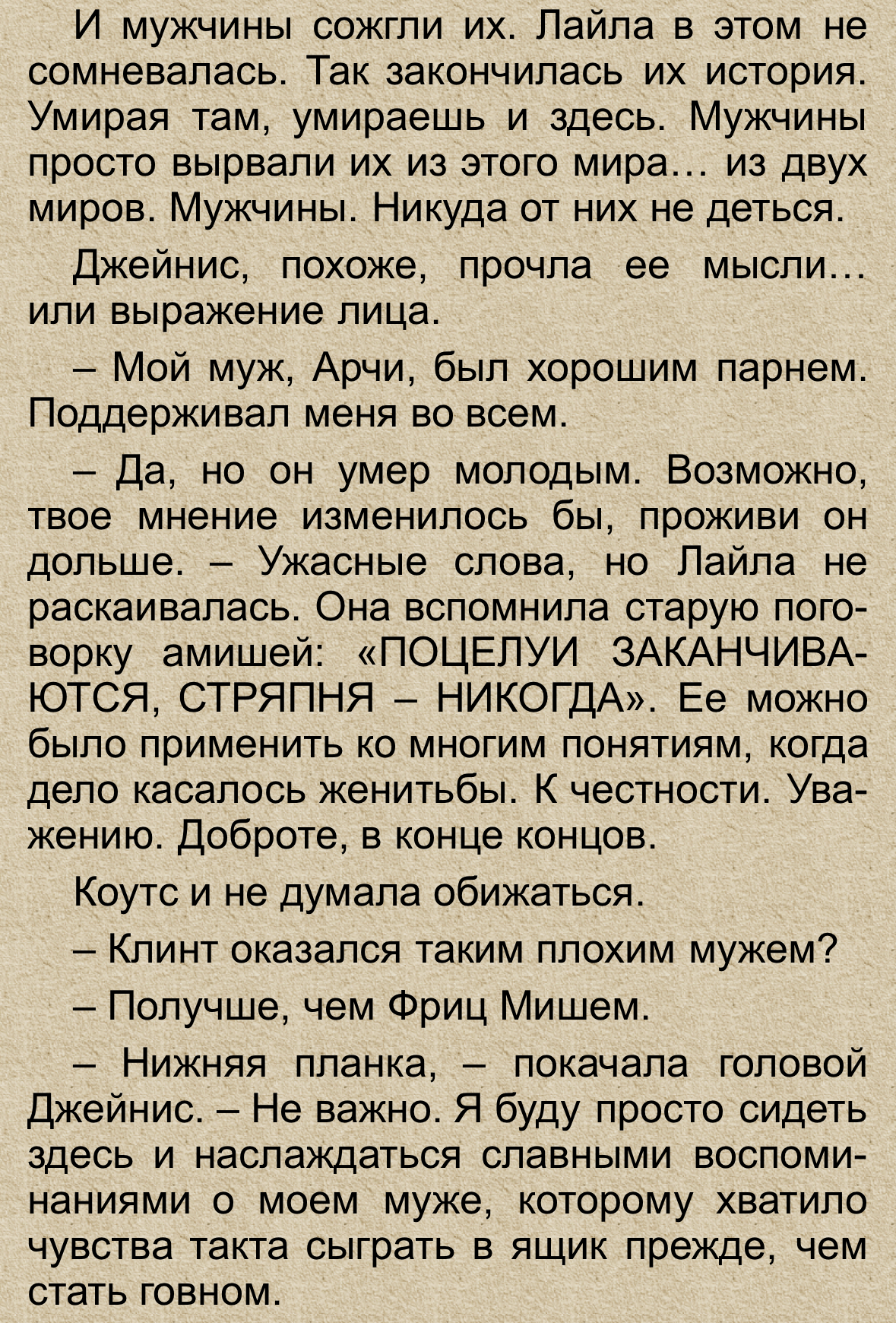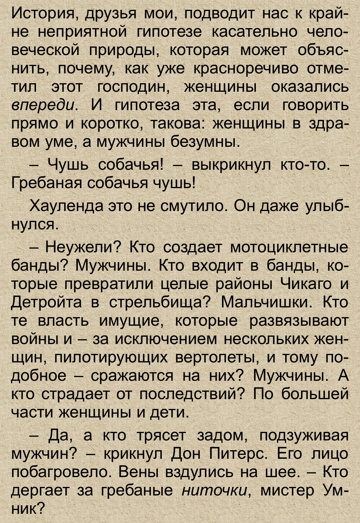 Пиздос, говно на уровне Мобильника. Роман про ебаных мужланов и смелых тяночьек, которые почти построили утопию без мужичья, но всё же решили простить их и вернуться. Всё, боксёр прочитан. Жду качественного перевода нового романа про Холли, потом после него перечитываю Сердца в Атлантиде, потому что когда-то мельком прочёл его в больнице. Думаю как минимум 1-2 романа он ещё напишет перед смертью.