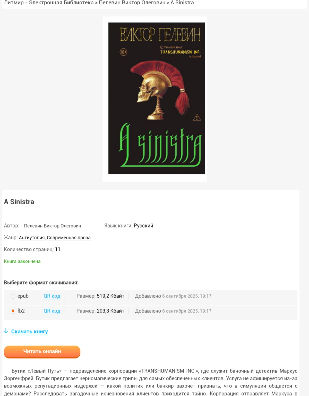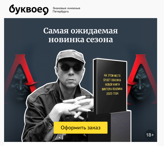 Интересно, радуется ли Пелевин сейчас своей молчаливости и незаметности, благодаря которой его не закинут в иноагенты? По-моему, чтобы быть популярным российским писателем и не быть иноагентом (быков, сорокин, акунин, улицкая) нужно либо подсоснуть Пыне, как Елизаров, либо быть писателем второго эшелона, как Михайлов или какой-нибудь Шишкин-Водолазкин. А Витя ловко придумал. Вот и от молчанки дивиденды. P.S. Теория шаткая и натянутая, можете об этом не писать. Тот же Водолазкин и Шишкин популярнее Елизарова, если брать тиражи и цитируемость, а не мемность на дваче. И обоих спасает то, что это бабская интеллектуальная литература без претензий, там крамолу надо старательно откапывать.