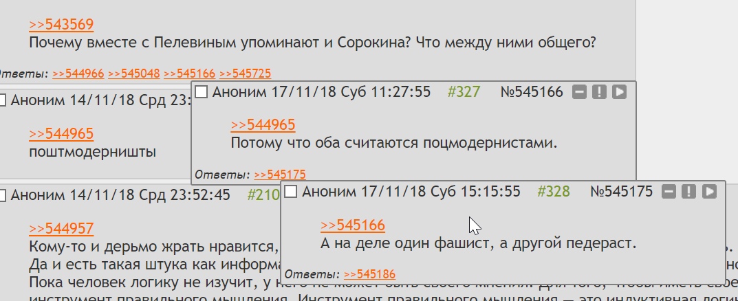 >>1027863 В 90-х это ещё как-то могло сойти за норм, тем более и книги у него подозреваю тогда были получше, и на фоне духовного вакуума, и постмодерн в РФ в новинку. А сейчас если эти люди до сих пор читают плеве я даже не хочу представлять их ебала, это должны быть ультимативные говноеды, финальные боссы говноедов. А уж те из его поклонников которые неироничные шизы и за столько лет не вылечились, там уже не клиника а целый медицинский центр.