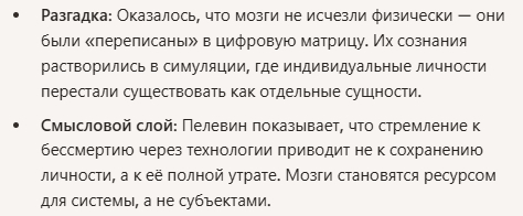 >>1031928 Понимаешь, у него тут комплексно все темки педалируются, которые с 22 года начали активно форситься. И про свинолюдов, и про нейросеточки, и про правду матку в сми, и про то как войны продавливаются А еще смешно пиздец просто, животики надорвал натурально несколько раз, а я не помню когда последний раз с книжки или кинча какого хохотал в голосину, а тут прям неоднократно за прочтение Крч ща буду всего Пелевина в порядке написания наворачивать