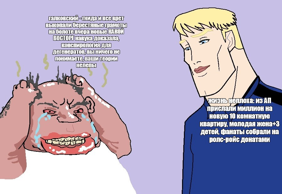 >>944526 Ты просто должен понять один простой вещь. Галковский это про калтонай малтонай ширин вырин мордехай маде ин Галковский. Человек натурально высасывает из пальца концепции, рассказывает про то что он "всегда прав", хотя количество косяков в его беседах уже стремится к бесконечности. Это видно хотя бы по тому, что большая часть его видосов посвящены социал-демократам. Само копание в нижнем белье социал демократических сект у него получается отлично. Но как только Галковский выходит за пределы этой концепции, начинается шиза, типа там вижу тут не вижу, и попытки притянуть любую информацию к его основной концепции англоцентрической русофобии.