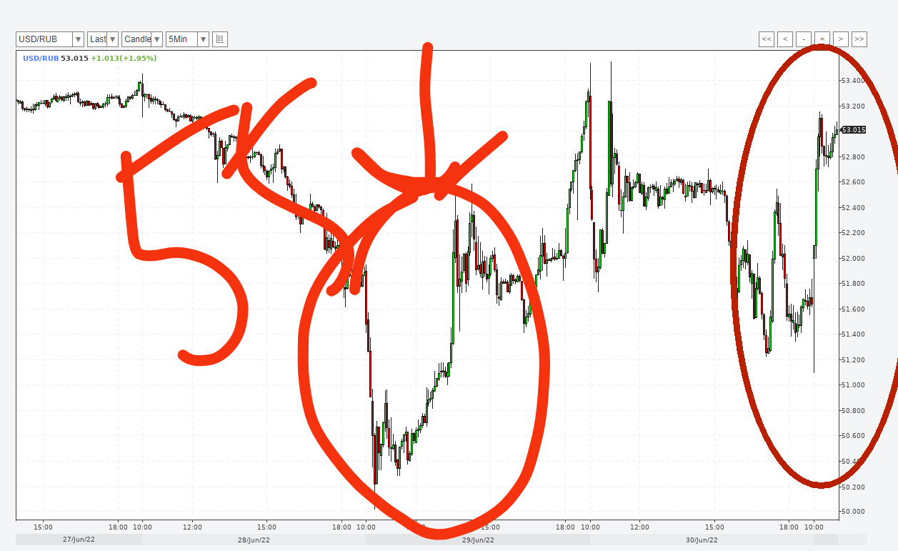 Таки поздравляю всех ждунов. По всем признакам дегенераты из Минфина все-таки возобновили валютные интервенции - ничем иным такой скачок курса за день не объяснить. И повторного доллара по 50 уже не предвидится, т.к. когда к концу месяца пойдут следующие платежи за газ и курс попрет вниз - эти немощные пидорасы, не способные наскрести рублей на выплаты зарплат бюджетникам-приживалкам другим способом, опять все в валюту вбухают.