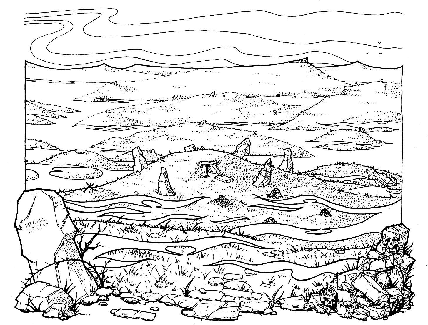 Рассвет. Ничего необычного, за исключением кучки обобранных трупов с перерезанными глотками в грязном переулке Гальгенбека. Всё ценное было украдено или вырезано, но ваше внимание привлекла сырая книга, лежащая в грязи разворотом вниз – личный дневник одного из убитых. Сумасшедший маг по имени Арвант, помимо своих параноидальных мыслей по поводу членов своего отряда, изложил о поручении монахов Кретонского Ордена – найти ⸸ЗИККУРАТ СМЕРТИ⸸, скрытый в глубине САРКАША и уничтожить демона, неупокоенного в нём. За это монахи пообещали выплатить мертвецам крупную сумму серебра. Монахи (в изложении Арванта) также упомянули, что в загадочных свитках говорится о том, что ЗИККУРАТ "спрятан в другом царстве" и что "жрецы носят ключи". ГЕРОИЗМ, ЖАЖДА НАЖИВЫ либо самая простая ГЛУПОСТЬ заставила троих приключенцев (или лишь часть из них?) покинуть город и направиться в САРКАШ в поисках того самого места. На данный момент группа всё еще находится в Гальгенбеке. Что же они решат делать дальше?