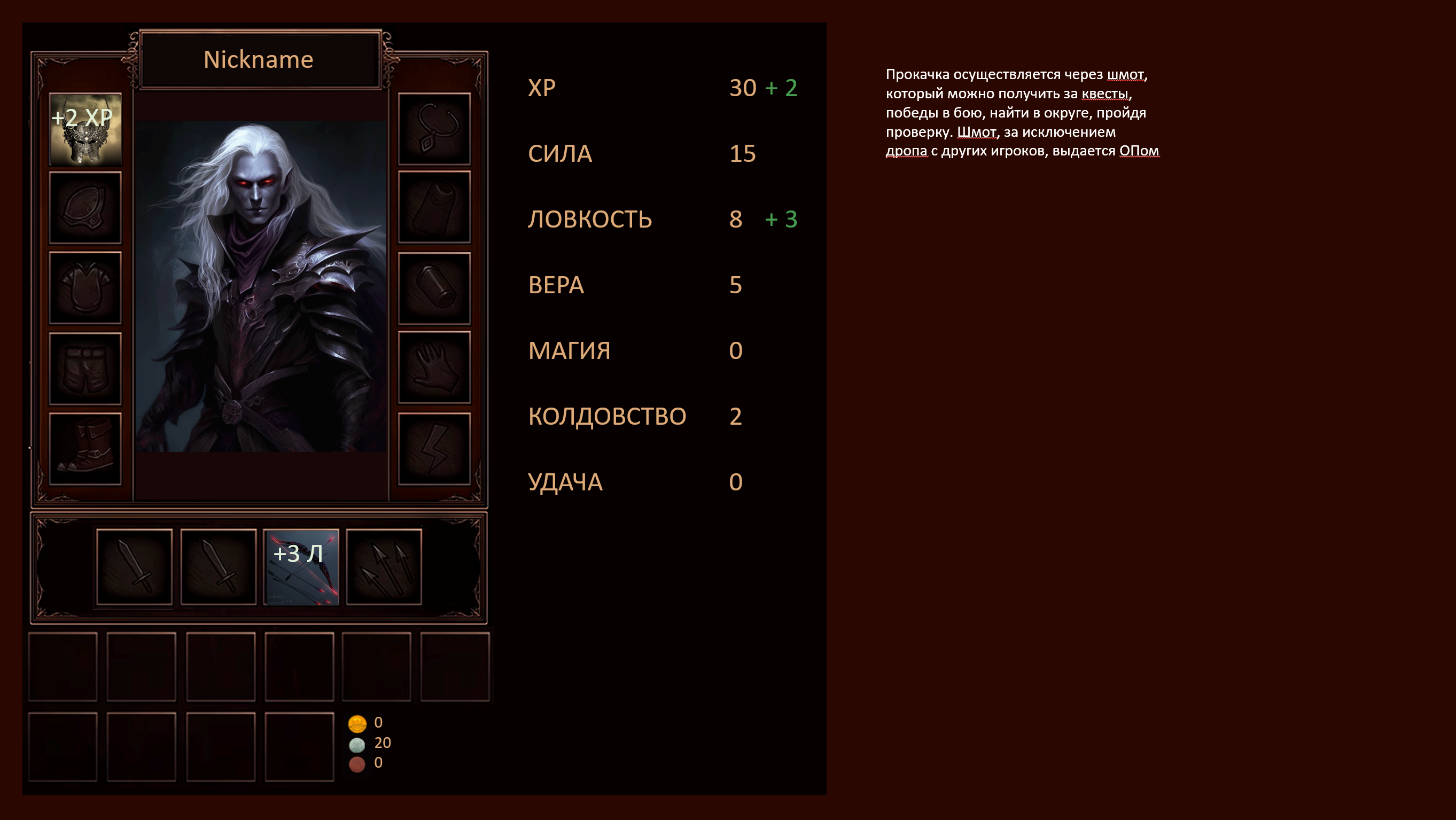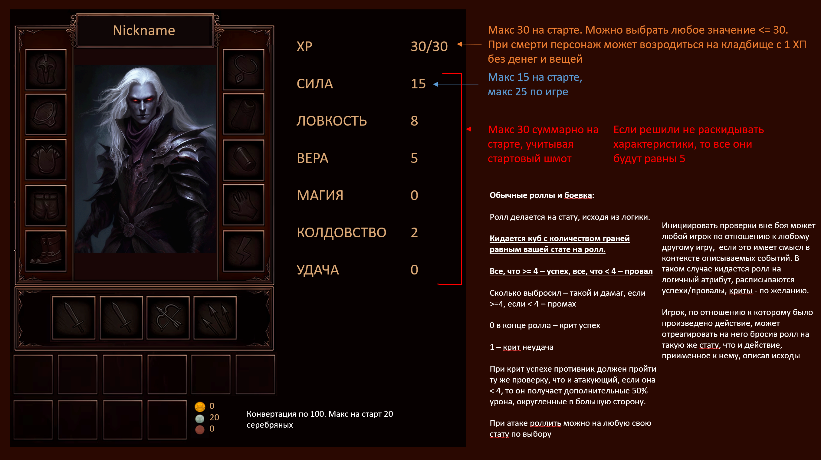 Пока можно ознакомиться с системой характеристик и роллов. Играть можно прикрепляя к посту худ - я его дам, возможно, в формате гугл-презы, чтобы игроки могли сами вбивать себе статы. Можно с укороченным худом - только статы без шмота. Можно совсем без худа - прописав статы в посте или вовсе не раскидывать их и оставить средние по умолчанию.