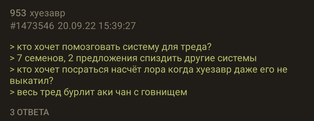 >>1523453 А Лора будет? Хочется делать с ней всякое. >>1523461 Значит слушай сюда, сынок нах. Кхилинир был потенциальным шином, но оказался провалом, по нескольким причинам. 1. Хуепрыга ввел многоГМство, в итоге произошли расхождения Лора, от чего у него подгорело. Так появилась мем про пресное/соленое озеро. 2. В него закатились всякая хуита, типа персонажей из вахи, которые сами бесили прыгу, но ему пришлось их водить так как правил они не нарушали. 3. Лора (топ пися ФТ) была деллольнута наху со всеми постами, от чего старого прыгослава хватила кондрашка и такого удара он уже не вынес.