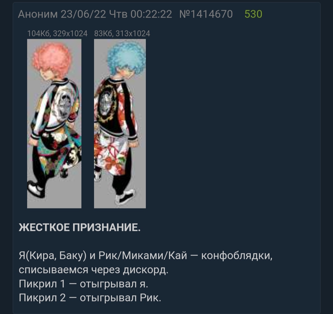 >>1528360 >а как он умер? Ситуёвина смешная была. Значит, тем июнем двадцать второго уже вкатились персонажи Рика(Кай/Такеру/Кайши Миками) и Баку-Кирьи(Собсна Баку). Собственно-Кота стал жертвой буллинга Баку(который уже стал подсосом Кая) — был избит, ну и его ещё поджарили как картоху. Кота выжил, и пришёл мстить, взяв ствол. Почти прибил Баку, но Кай тут как тут, всадил в Коту пулю, Баку хуйнул Собсна-Коту ножом... Короче говоря, сам Кота(ну игрок ебать) вместо хотя-бы коротенького рп-поста решил максимально рационально и лаконично отписать, выдав лучшую реплику этого треда — "ну и помер нах". А дальше полтореда организача был сраз по поводу божественного РП Коты.