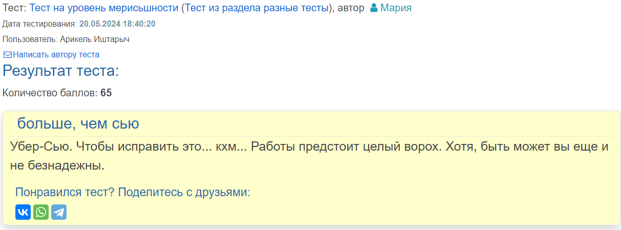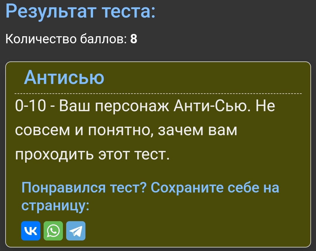>>1531353 1. Как звучит ваше полное имя? Ютака Нацуми 2. Где и когда вы родились? В Японии, городнейм, 2006 3. Кем были ваши родители? Офисный планктон 4. Есть ли у вас братья и сестры? Нет 5. Где и с кем вы живете сейчас? С родителями, но дома почти не появляюсь 6. Чем вы занимаетесь? Живу полной жизнью 7. Опишите вашу внешность. Может лучше покажу?.. 8. К какому классу общества вы принадлежите? Высшая знать 9. Есть ли у вас какие-либо аллергии, болезни или физические недостатки? Если бы даже были, то вы бы не узнали 11. Как звучит ваш голос? Как пение сирен 12. Какие слова и/или фразы вы используете особенно часто? Те, которые стону во время секса 13. Что у вас в карманах? У меня их нет 14. Есть ли у вас какие-либо причуды, странные манеры, раздражающие привычки? Нет, я идеальна 15. Как бы вы описали свое детство в целом? Восхождение звезды 16. Какое у вас самое раннее воспоминание? В детском саду показываем с мальчиком друг другу письки 17. Получили ли вы образование? В процессе 18. Если да, нравилось ли вам учиться? Нет! 19. Как вы приобрели большинство своих навыков и способностей? С удовольствием... 20. Были ли у вас примеры для подражания? Ким Кардашьян, Софи Лорен и Фридрих Ницше 21. Вы ладили с другими членами семьи? Нет, они придурки 22. В кем вы хотели быть, когда станете взрослым? Звездой 23. Чем вы любили заниматься, когда были ребенком? Сплетничать 24. Какие черты характера вы демонстрировали в детстве? Привлекательность 25. Вы были популярны среди других детей? С кем вы дружили? Неимоверно. Друзей меняла как тампоны 26. Когда и с кем был ваш первый поцелуй? С сыном маминой подруги, в 6 лет 27. Вы девственник/-ца? Естественно. 28. Если у вас есть сверхъестественные способности (вы маг, оборотень или вампир), что это за способности и как вы их получили? Есть сверхъестественная "харизма" 29. Какое событие в своей жизни вы считаете самым важным? Каждое! 30. Кто оказал наибольшее влияние на вас? Никто, я оказываю на всех влияние 31. Что вы считаете своим самым большим достижением? Я родилась собой. 32. О чём вы больше всего жалеете? Ни о чём 33. Самый злой поступок, который вы когда-либо совершили. Таких нет. 34. Есть ли у вас судимость любого рода? Я бы откупилась.. 35. Что вас когда-либо испугало сильнее всего? Прыщ на лбу перед выпускным из средней школы 36. Самое неловкое, что когда-нибудь случалось с вами. Быть единственной девушкой на свингер-вечеринке 37. Если бы вы могли изменить одно событие в прошлом, что бы это было? Почему? Ничего 38. Какое у вас лучшее воспоминание? Секс с... Он попросил не распространяться. 39. Какое у вас худшее воспоминание? Заставили делать домашку дома у задрота 40. Вы больше оптимист или пессимист? Оптимист 41. Какой у вас самый большой страх? Стать серой мышкой 42. Каковы ваши религиозные взгляды? Я сама богиня! 43. Каковы ваши политические взгляды? Либеральные, феминистические 44. Каковы ваши взгляды на секс? Открытые 45. Способны ли вы убить? А плод считается? 46. По вашему мнению, какое самое большое зло может совершить человек? Навредить мне. 47. Верите ли вы в существование истинной любви? Да. В меня. 48. Как вы считаете, что делает жизнь успешной? Поклонники. 49. Насколько вы искренний? На 100% 50. Есть ли у вас какие-либо предубеждения или предрассудки? Нет 51. Есть ли что-то, что вы никогда, ни при каких обстоятельствах не сделаете? Принять кал - это слишком! 52. Есть ли что-то (или кто-то), ради чего вы гот