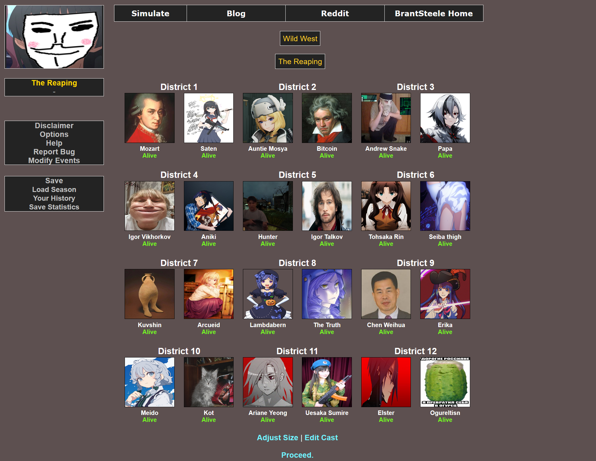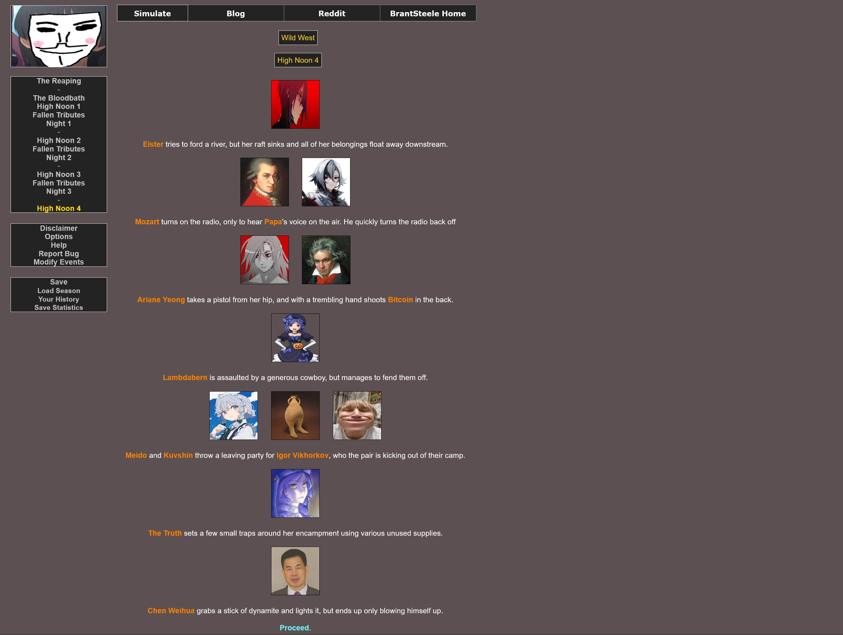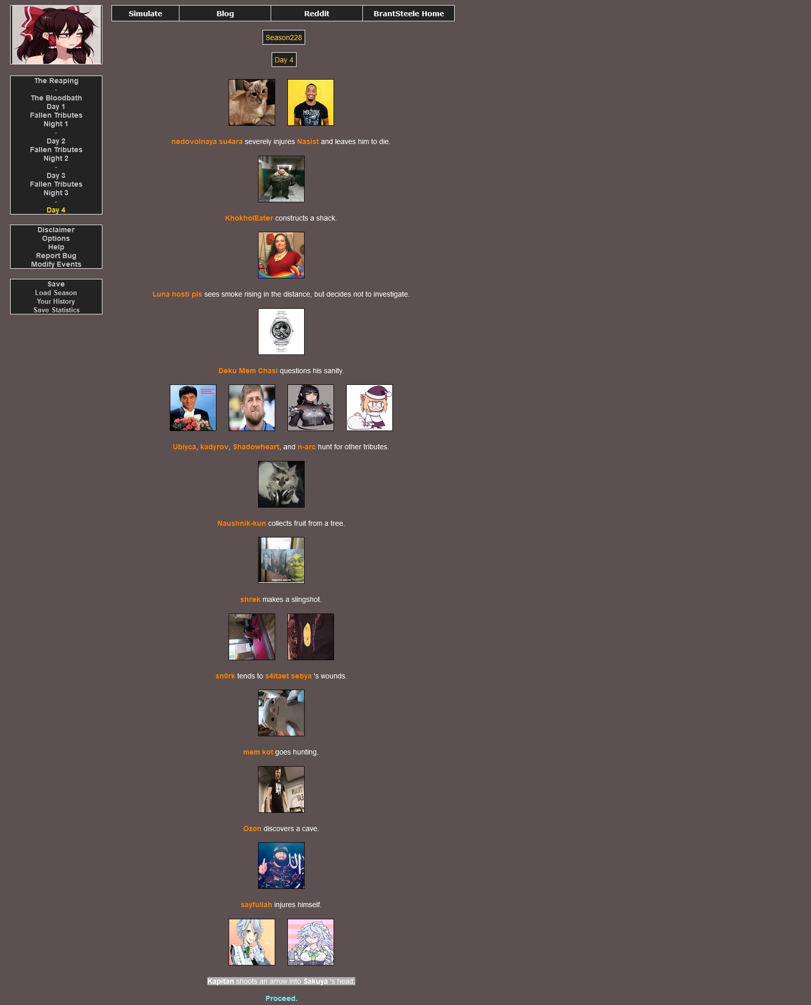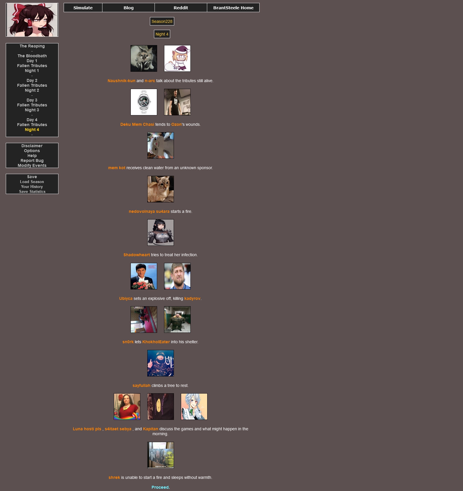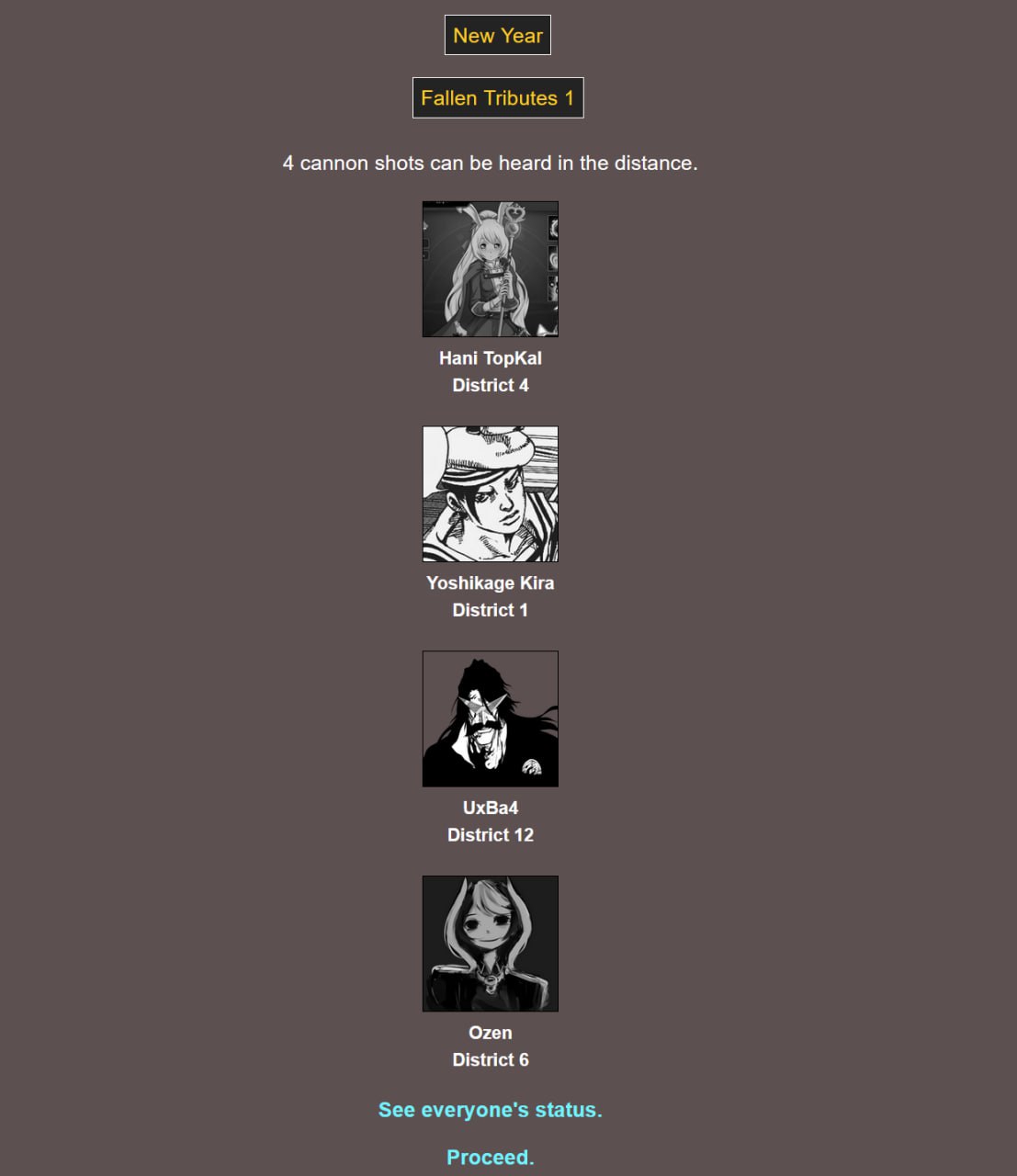 >>1536877 1. Ждёшь, когда хост даст команду на сбор персонажей. Например, как тут >>1536786 2. Вкидываешь в тред имя персонажа + его аватарку, как тут >>1536792 3. Запасаешься попкорном, ждёшь, когда наберётся 24 персонажа на игру в текущих полудохлых реалиях придётся ждать не один день. Затем наблюдаешь за тем, как твой персонаж пробивается к первенству в симуляции Голодных Игр. Ну или скорее получает перо в бочину на первый-второй день. 4. ??? 5. PROFIT!