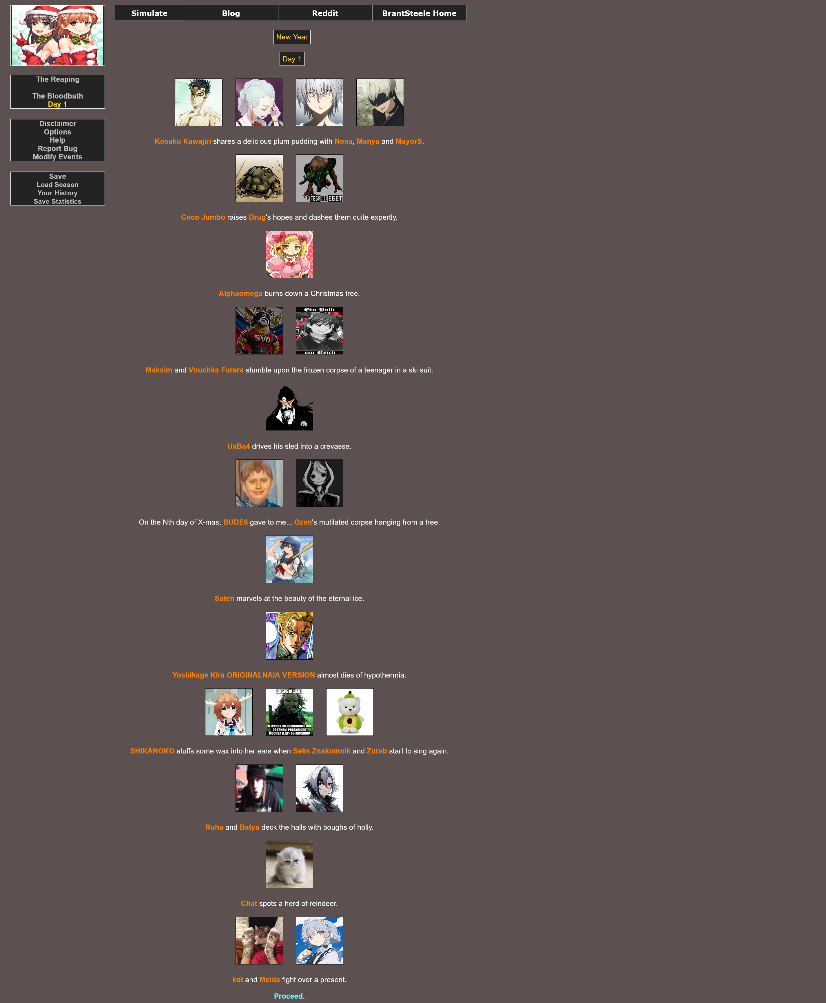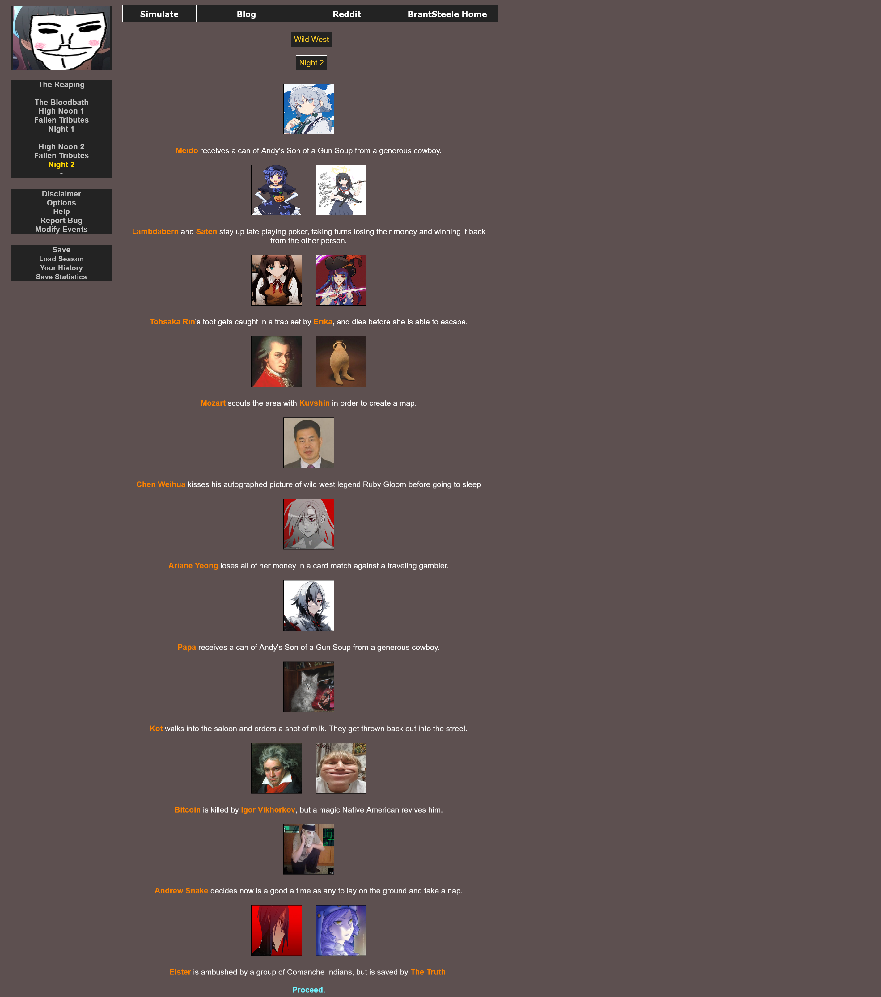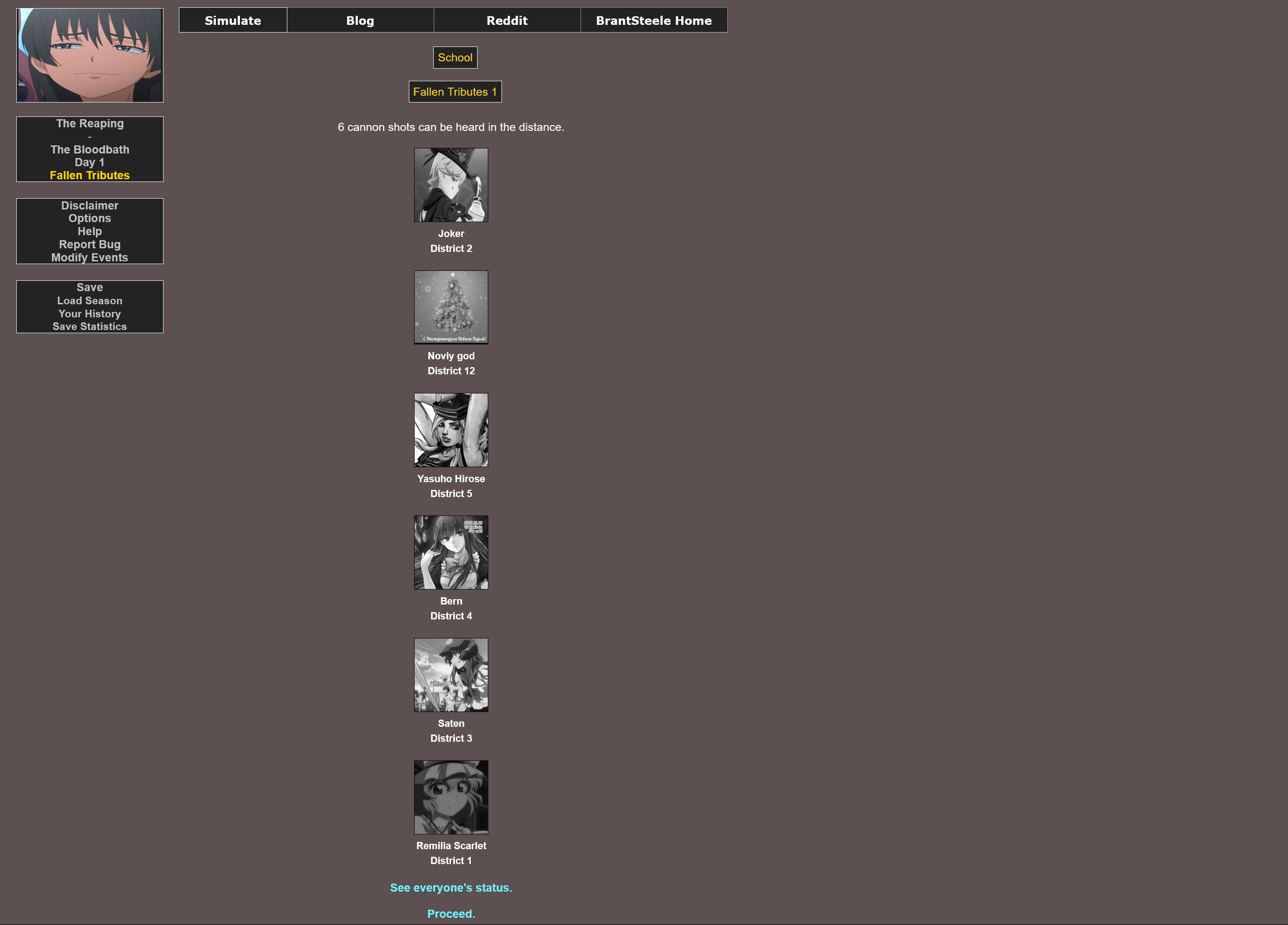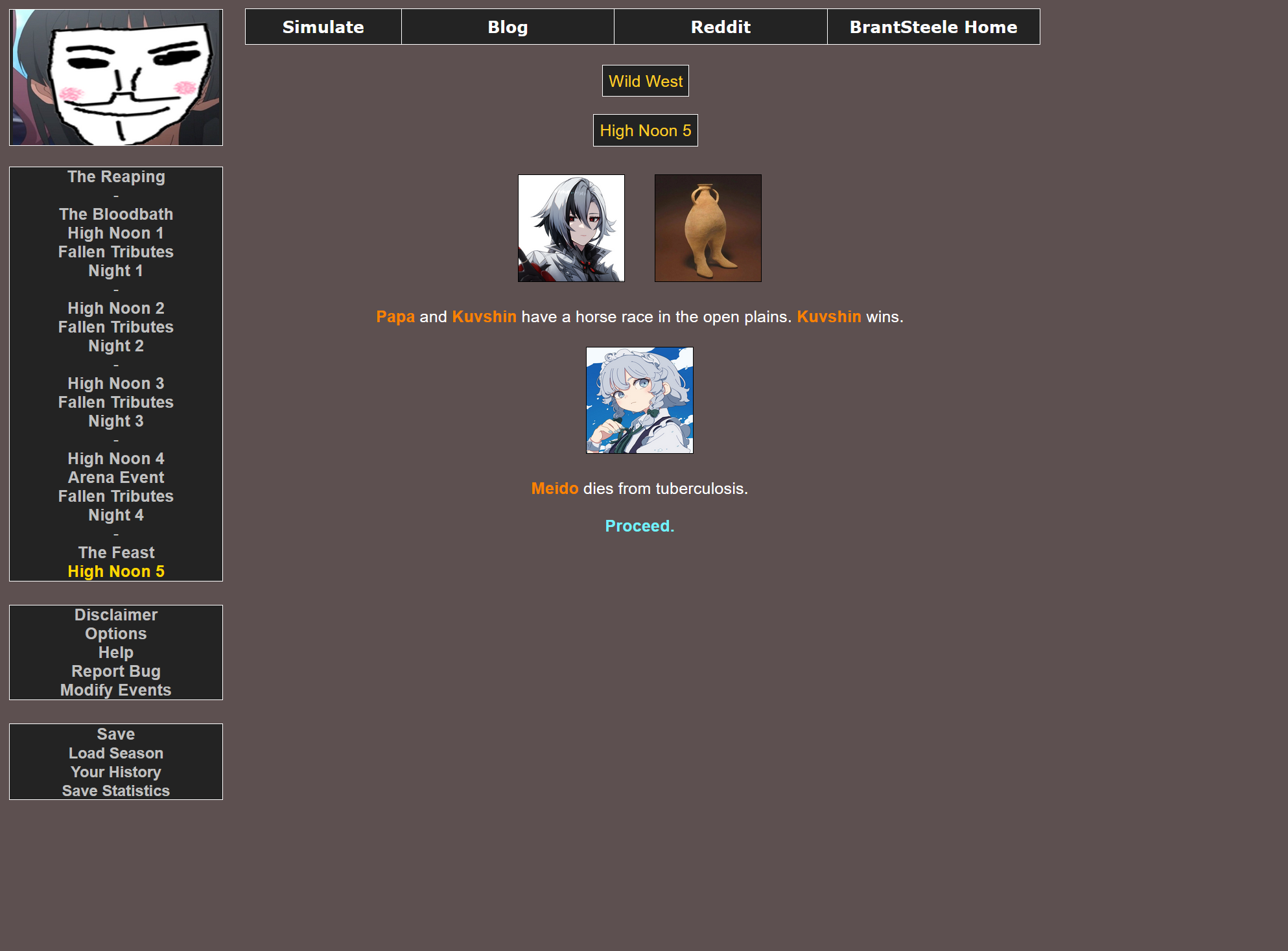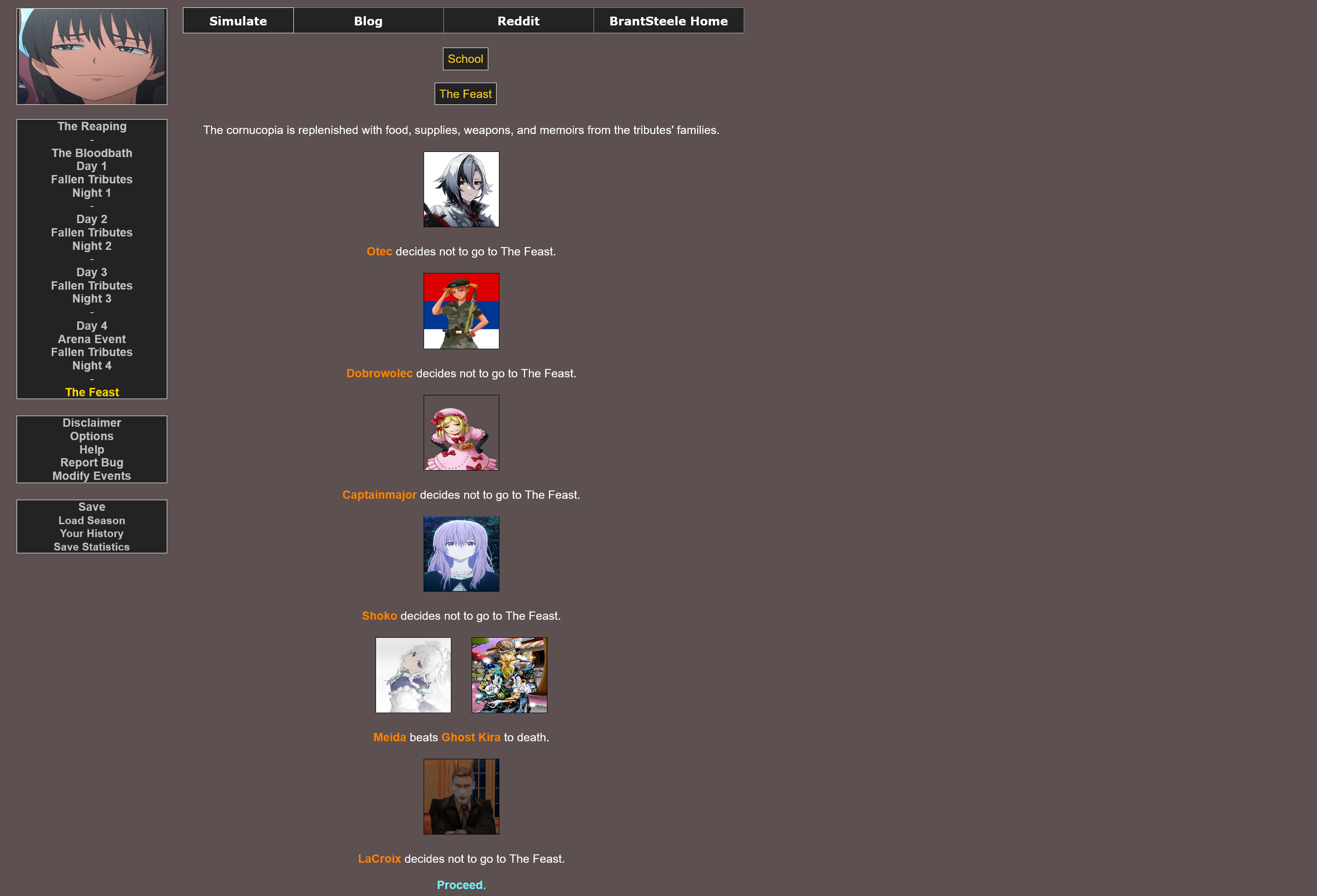 >>1536877 1. Ждёшь, когда хост даст команду на сбор персонажей. Например, как тут >>1536786 2. Вкидываешь в тред имя персонажа + его аватарку, как тут >>1536792 3. Запасаешься попкорном, ждёшь, когда наберётся 24 персонажа на игру в текущих полудохлых реалиях придётся ждать не один день. Затем наблюдаешь за тем, как твой персонаж пробивается к первенству в симуляции Голодных Игр. Ну или скорее получает перо в бочину на первый-второй день. 4. ??? 5. PROFIT!
