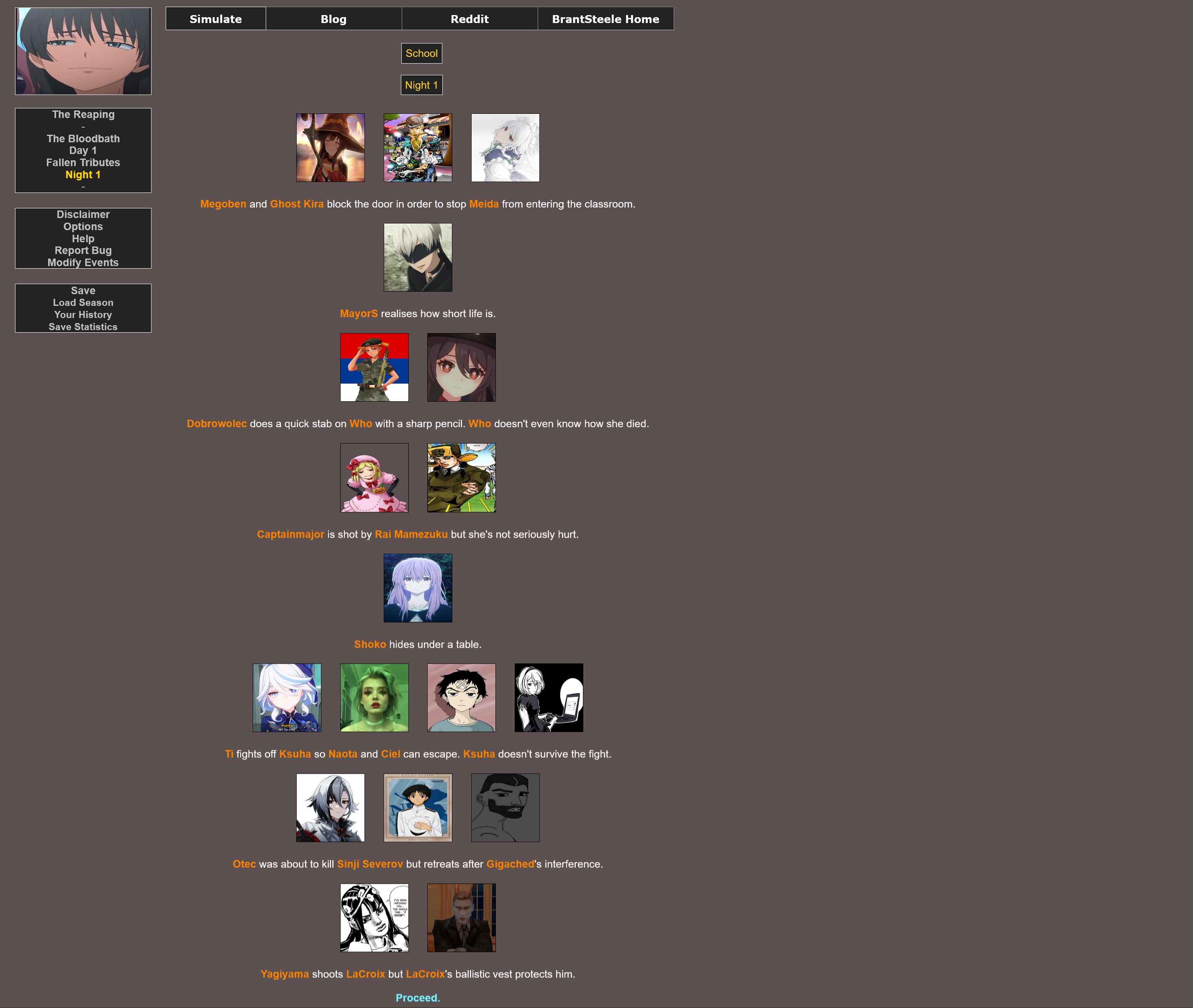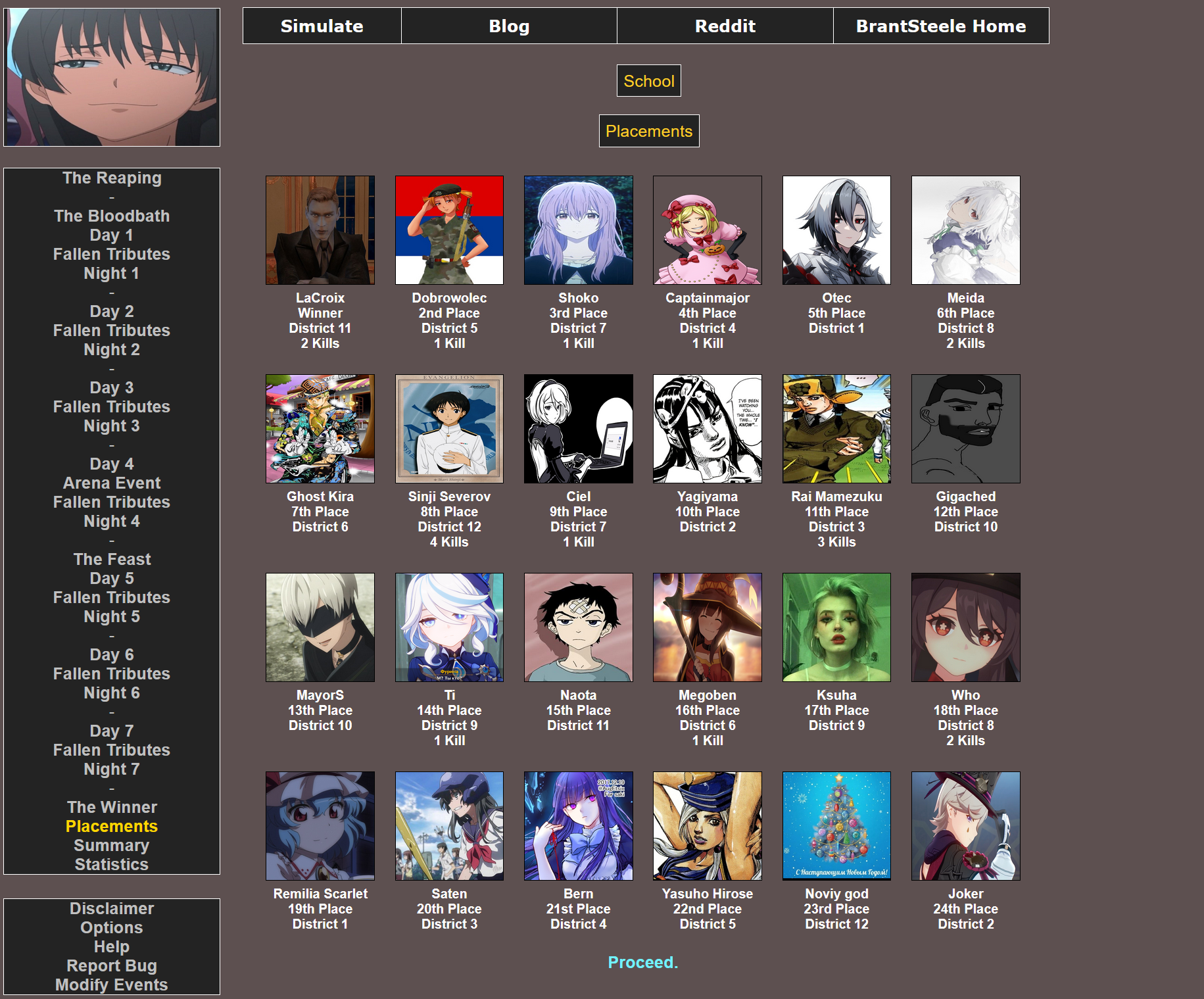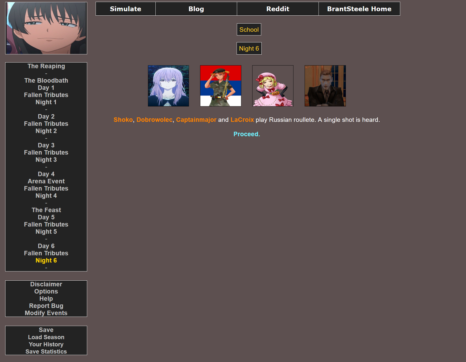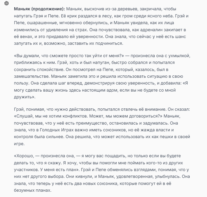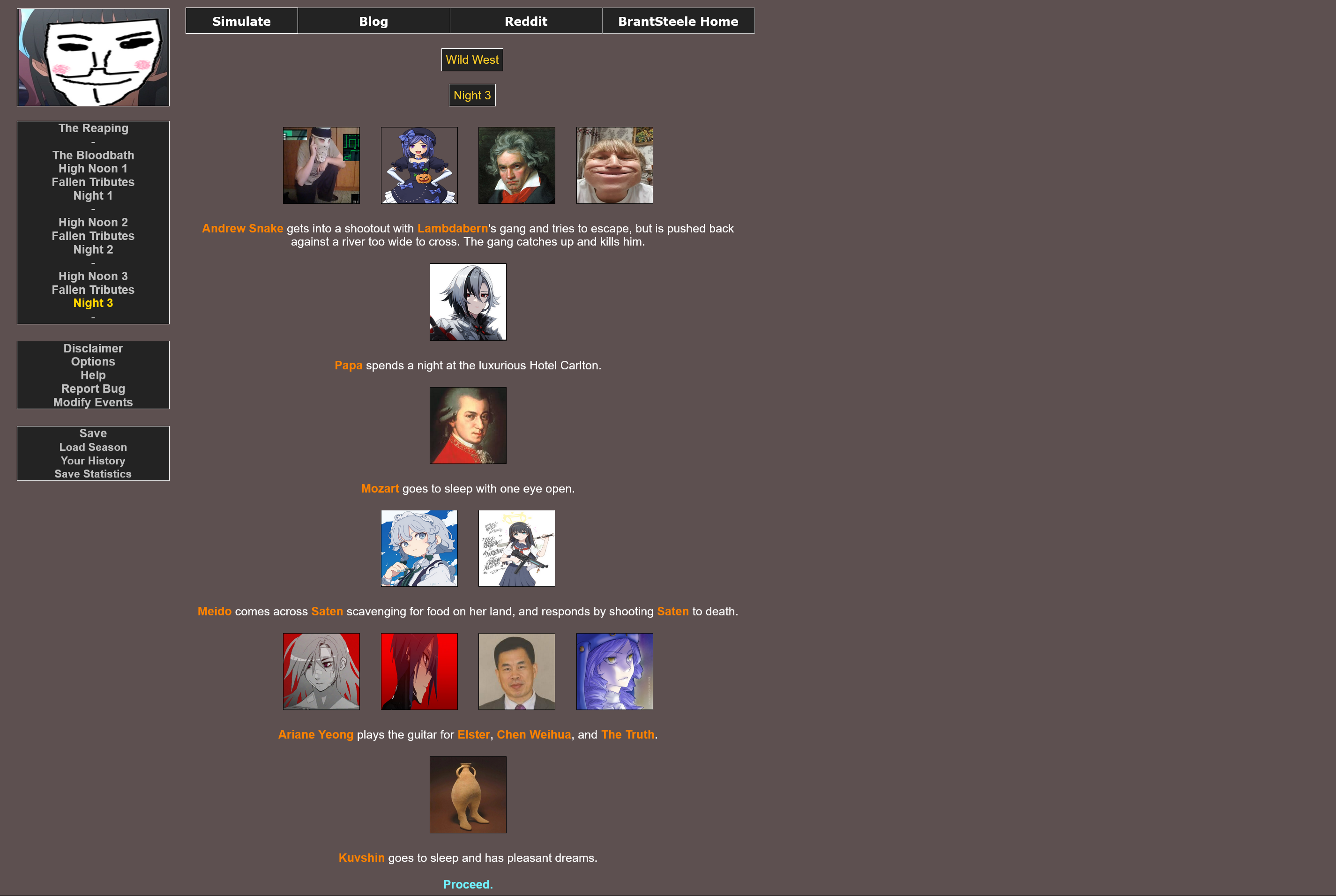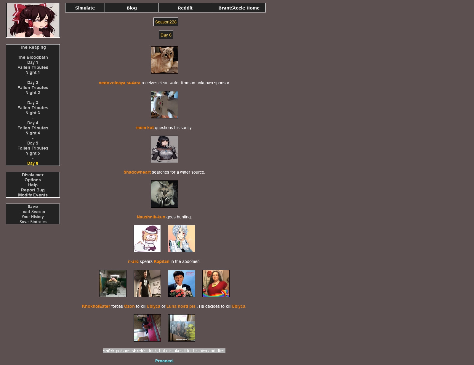 >>1536877 1. Ждёшь, когда хост даст команду на сбор персонажей. Например, как тут >>1536786 2. Вкидываешь в тред имя персонажа + его аватарку, как тут >>1536792 3. Запасаешься попкорном, ждёшь, когда наберётся 24 персонажа на игру в текущих полудохлых реалиях придётся ждать не один день. Затем наблюдаешь за тем, как твой персонаж пробивается к первенству в симуляции Голодных Игр. Ну или скорее получает перо в бочину на первый-второй день. 4. ??? 5. PROFIT!